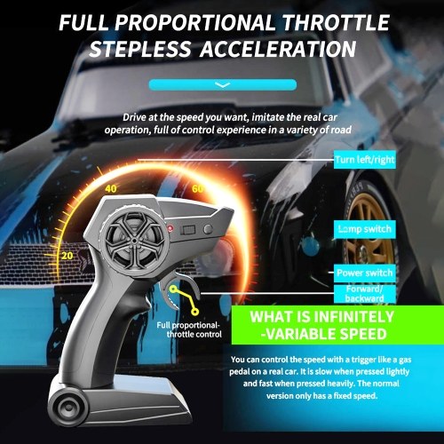 Function: 2.4GHz, 1/16, full proportional throttle, forward/backward, left/right turn, 360° drift, spray with light.