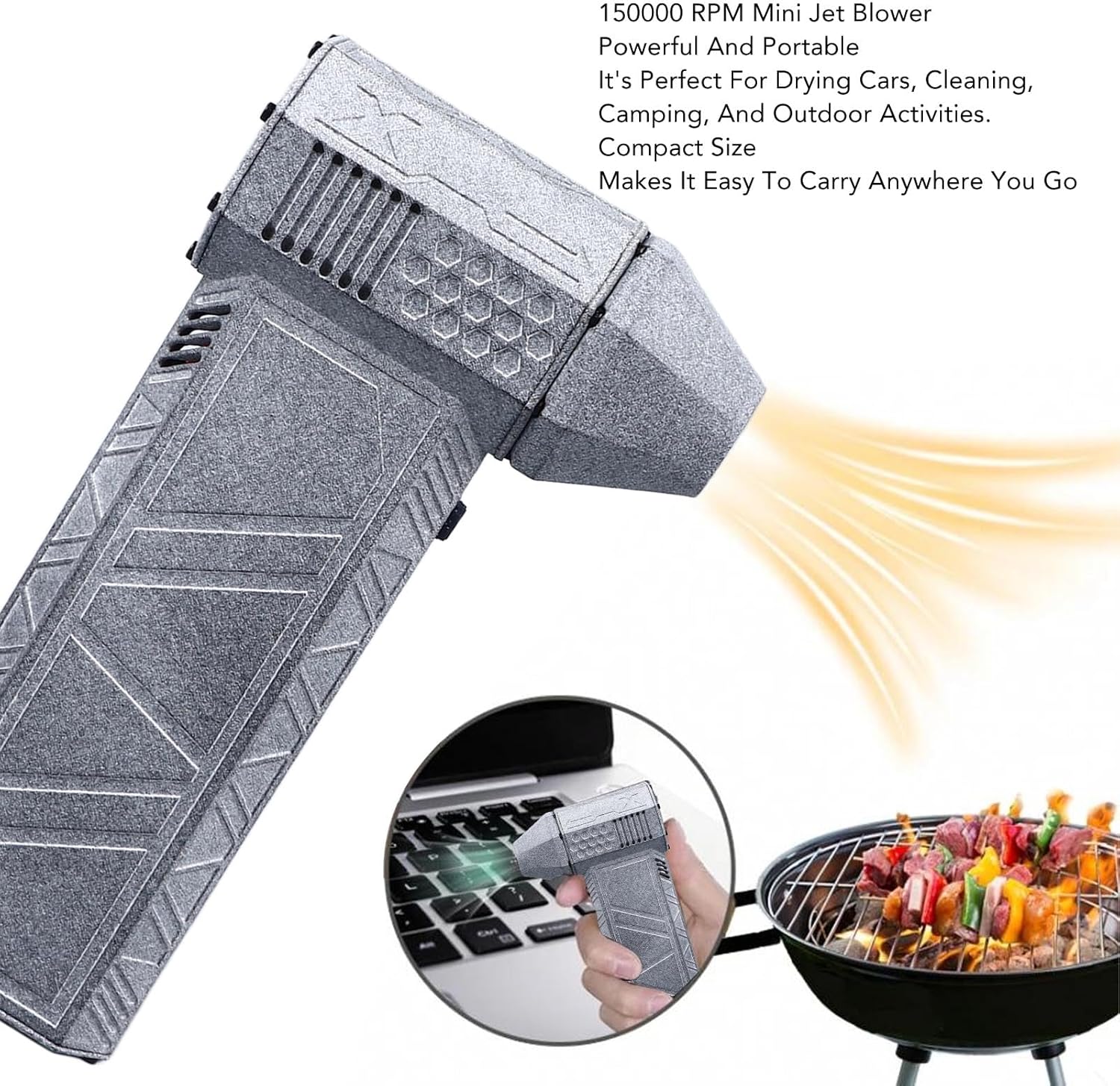 Powerful and Portable: Our mini jet blower is compact and lightweight, making it convenient to carry during outdoor activities. With a brushless high speed DC motor, it can reach speeds of up to 150,000 RPM and produce an airflow of 22 m/s.