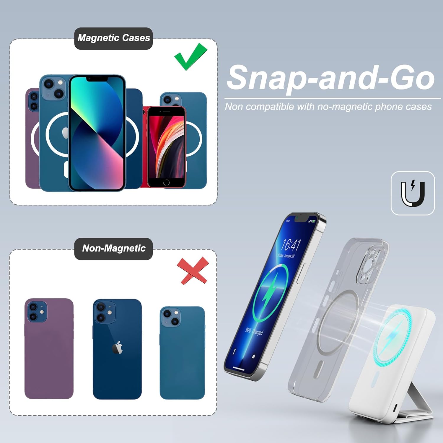 Magnetic Wireless Power Bank: This battery charger portable is perfectly designed for iPhone 15, iPhone 15 Plus, iPhone 15 Pro, iPhone 15 Pro Max, iPhone 14, iPhone 14 Plus, iPhone 14 Pro, iPhone 14 Pro Max, iPhone 13, iPhone 13 mini, iPhone 13 Pro, iPhone 13 Pro Max, iPhone 12, iPhone 12 mini, iPhone 12 Pro, and iPhone 12 Pro Max. Note: We recommend charging with MagSafe phone case or without cases to get enough suction for better grip.