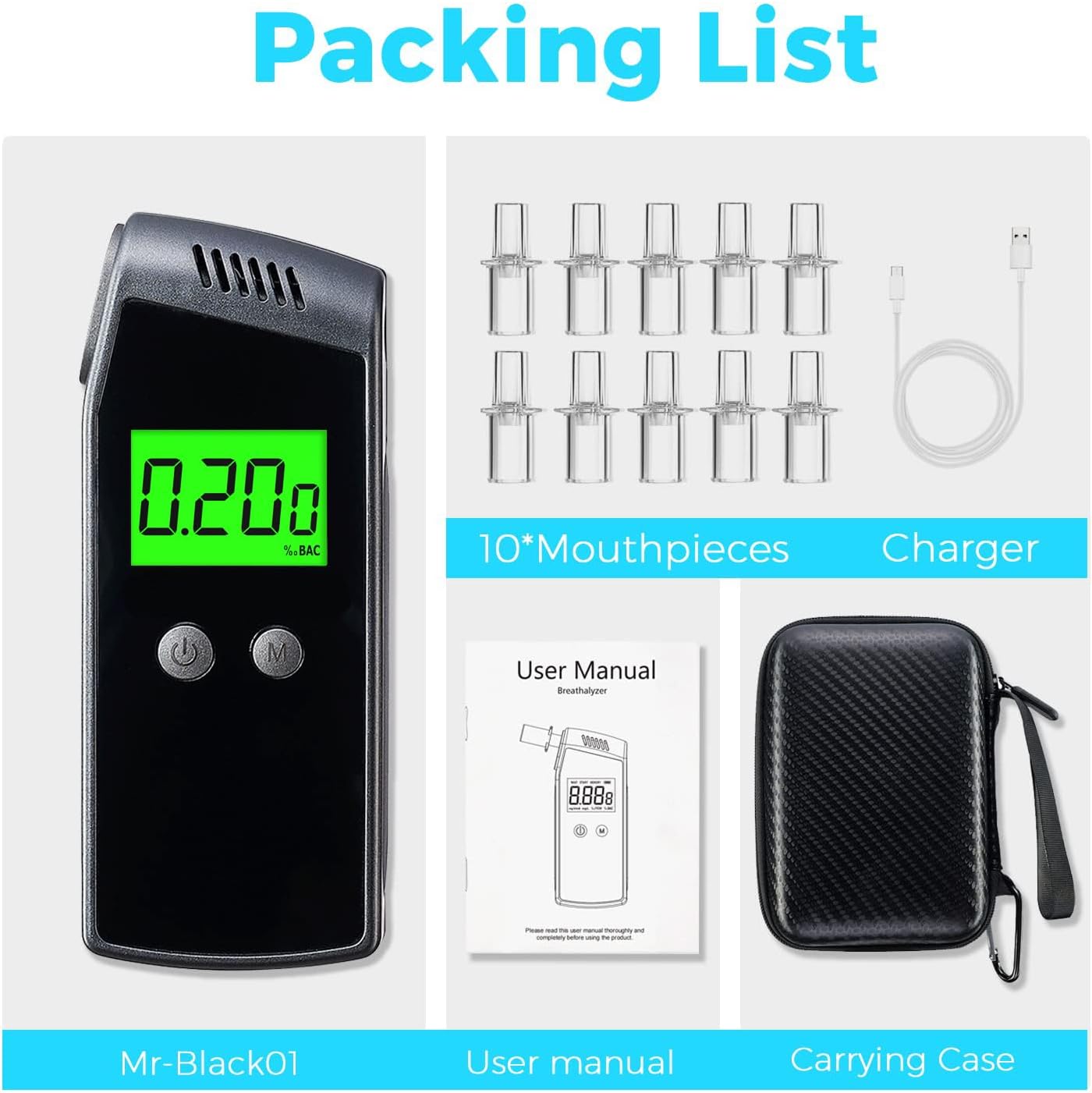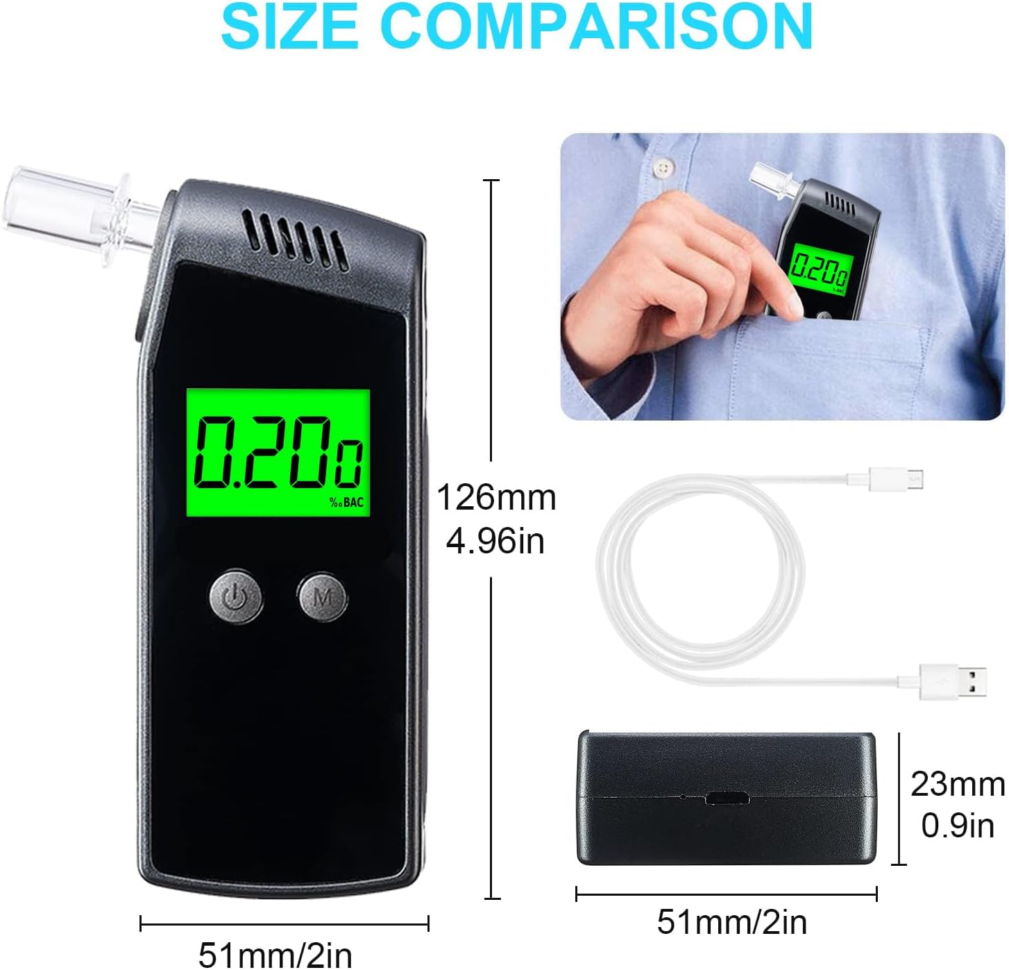 PORTABLE BREATHALYZER: The professional breathalyzer is only 126x51x23mm, and weighs only 90g, which is very convenient to carry on the go out and it can easily be put in the bag and car.