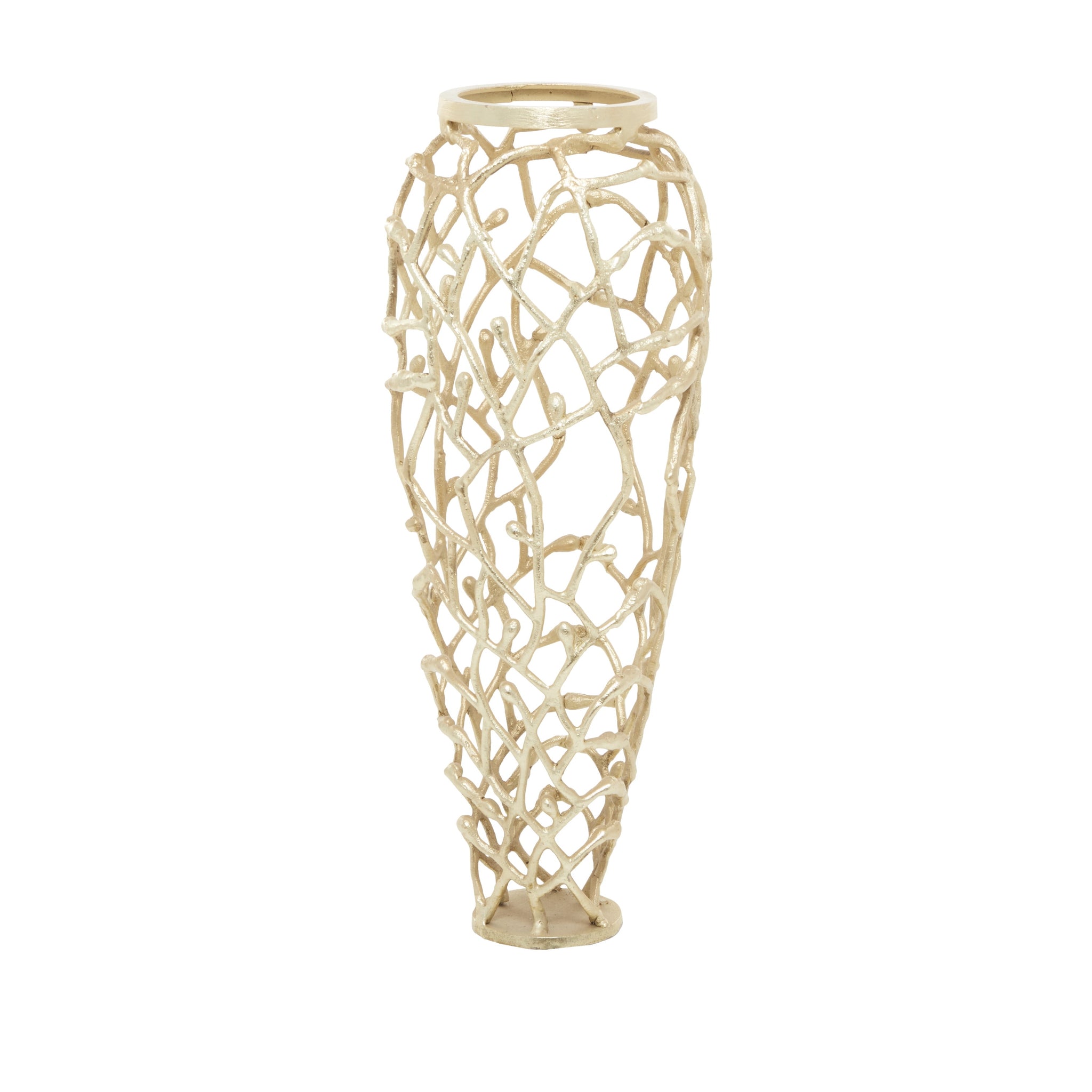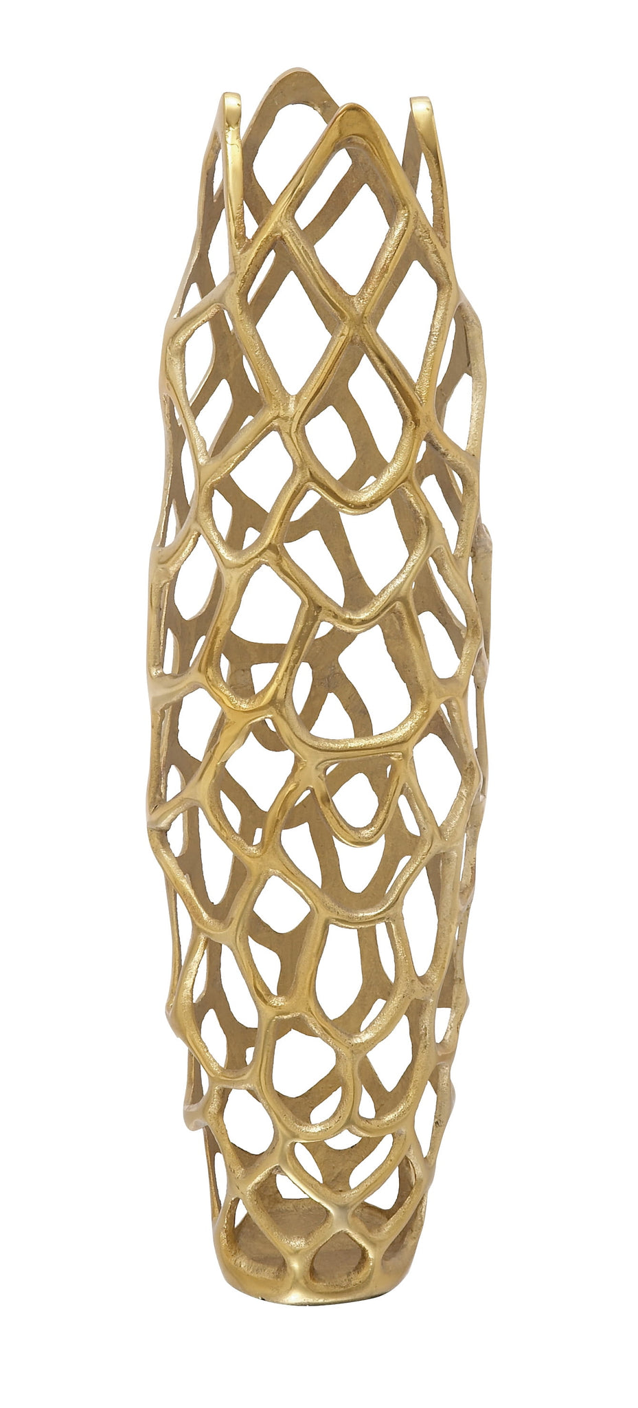 • Impressive shiny gold floor vase showcases a tall body with a deep setting, and designed with an abstract cut-out pattern that gives a unique appeal to your home
