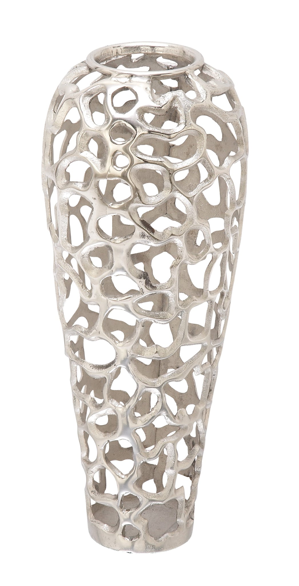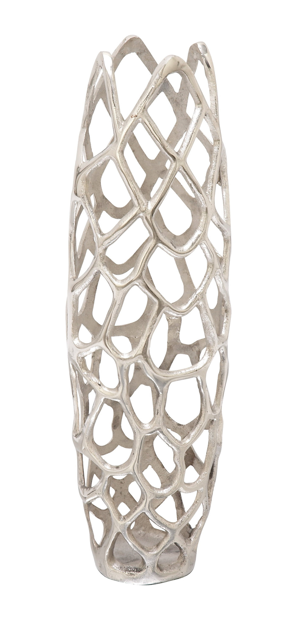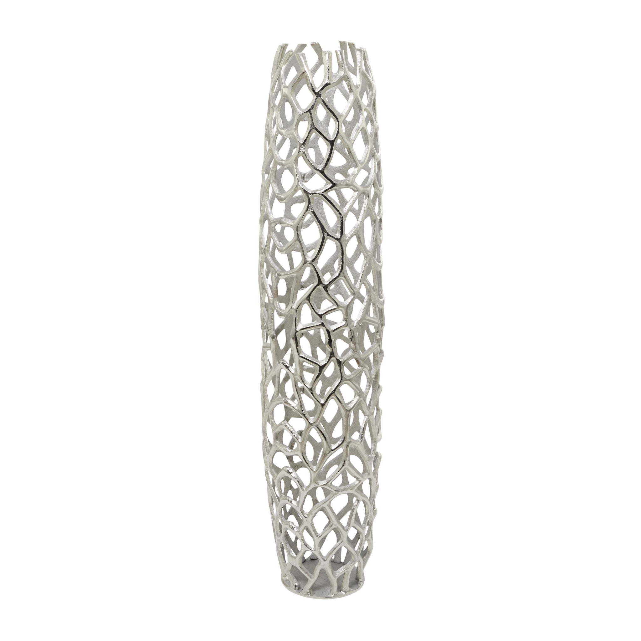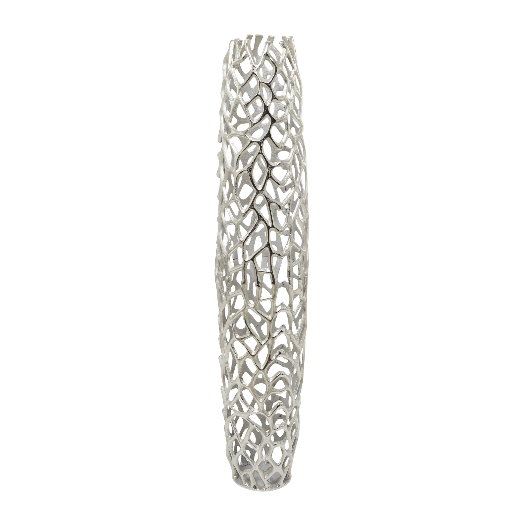 DecMode 45" Coral Silver Aluminum Vase is a unique addition to your stylish home. The unique and attractive design of this gold abstract decorative vase makes it an instant conversation piece and a gorgeous accent decor for your home. Designed with felt or rubber stoppers at the base that prevent scratching furniture and table tops, as well as sliding around. This item ships in 1 carton. Suitable for indoor use only. This item ships fully assembled in one piece. Made in India. This is a single silver colored vase. Contemporary style. Vase has a 5 in mouth opening.