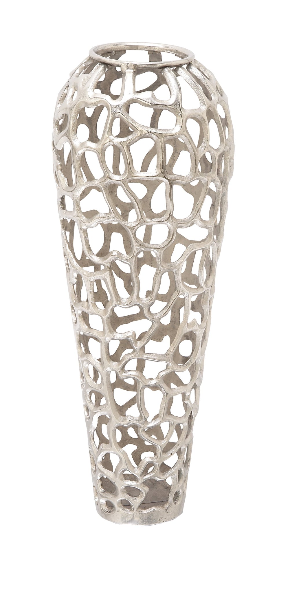 • Shiny Silver vase is constructed of forged aluminum material to create an elongated, deep vase body with intricate cut-outs