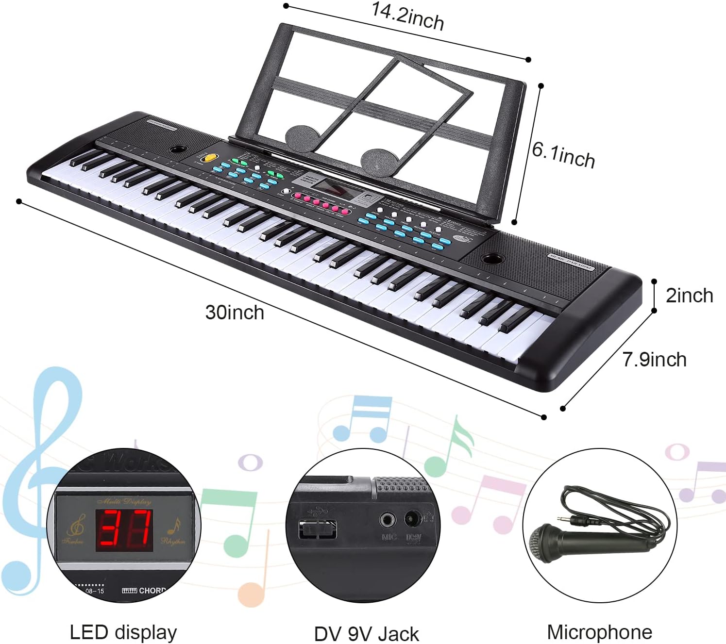 【Multifunctional 61 Key Piano】This keyboard piano Designed for beginners features 61 standard-size keys, 10 styles of music rhythm,6 demonstration songs,16 timbre amount double speaker, recording/programming/insertion+volume/tempo, display, microphone, and music stand. Product size:29.9 inch W x 7.9 inch D x 2.3 inch.