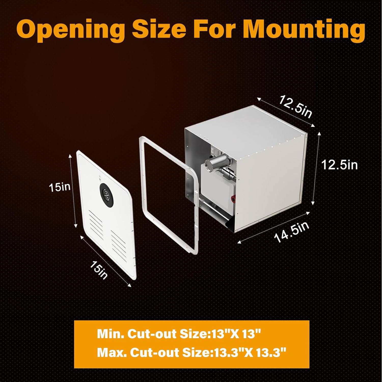 【15" by 15"door】The rv tankless water heater compatible with most RVs,the opening is 13" x 13"and The included door size is 15" by 15",It has a built-in pressure relief valve and remote control,saving you the hassle of buying and installing them separately.If your RV water heater is any other size you will need to purchase additional size 15"*18", 18"*18" door(not included).