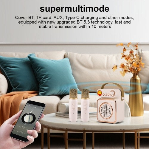 【Authentic KTV Experience】: With a mini microphone and speaker combo, our portable karaoke speaker provides you with a true KTV experience. Sing your heart out and enjoy the fun of karaoke anytime, anywhere. The BT 5.3 technology allows for seamless connection up to 10 meters, while the two wireless microphones ensure convenient and hassle-free singing sessions.