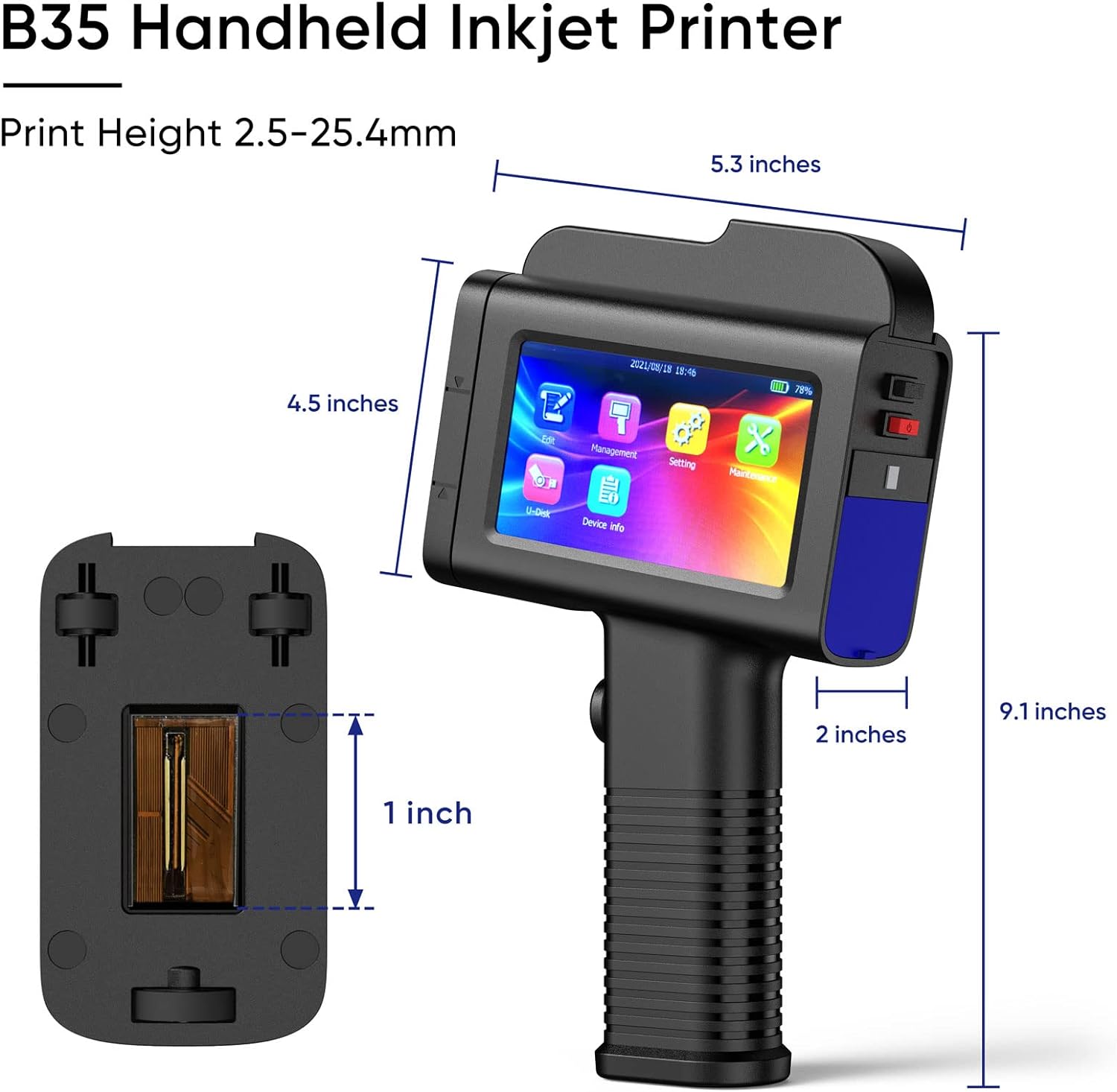 Equipped 1PCS of Quick-Drying Solvent Ink Cartridge EB22B-L in Black: This Handheld Inkjet Printer B35 Adopt the Original High-Definition Quick-Drying Ink Cartridge (Black), 1 inch Print Head up to 25mm Print Height, Print is Clear and Strong Adhesion. (Note: This Handheld Printer Ink Cartridge is Differ from Other Ink Cartridge, Please Choose the OLYBSJET original Ink Cartridges)