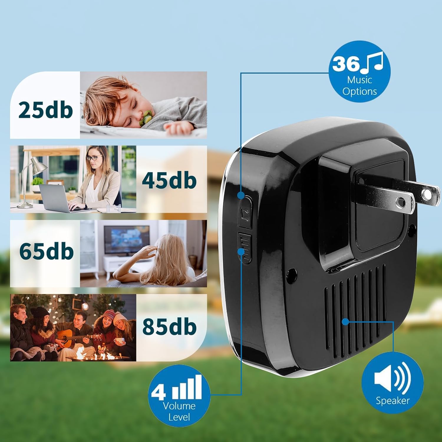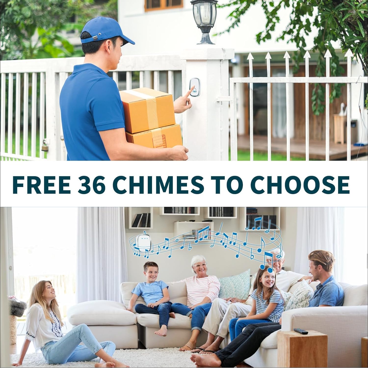 - 🔔36 Melodies & 4 Adjustable Volume - The Door Bell offers a wide selection of 36 chimes and 4 level adjustable volume(0 dB to 110 dB) to meet your different needs. Remembers your last melody and volume level after a power outage; memory function let you no need to reset.