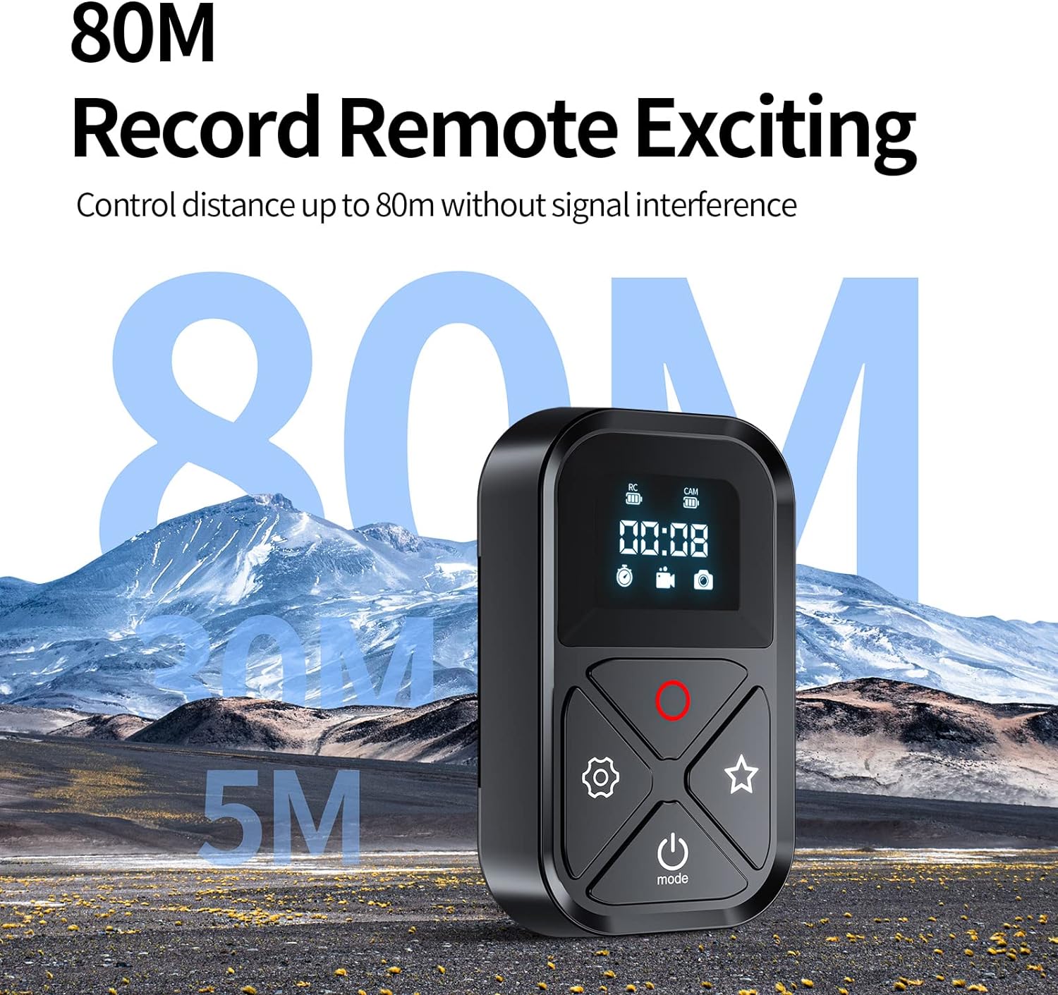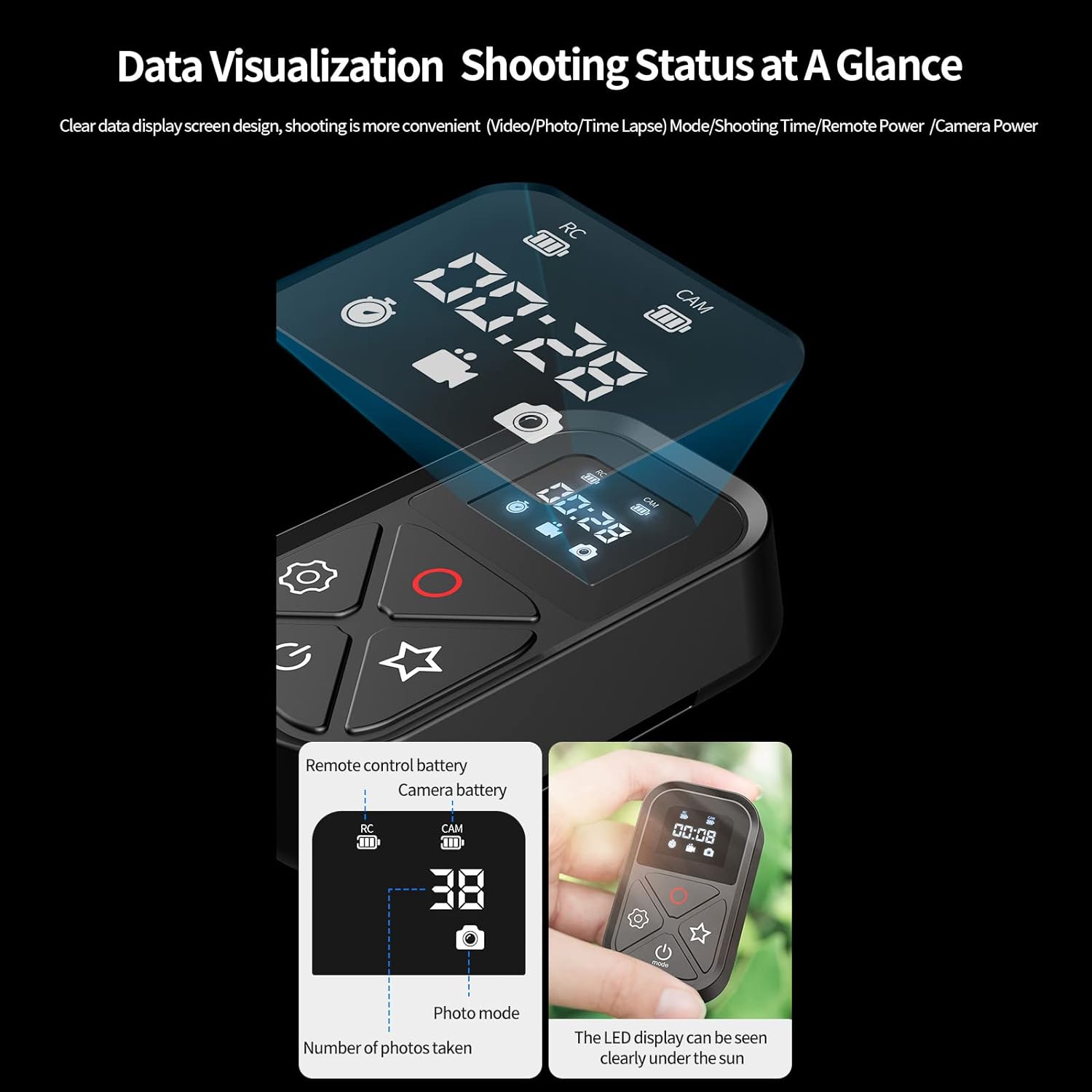 Écran LED S n : affiche la télécommande et la batterie restante de l'appareil photo, les modes de photographie et le temps d'enregistrement, peut être vu clairement même sous la lumière directe du soleil.