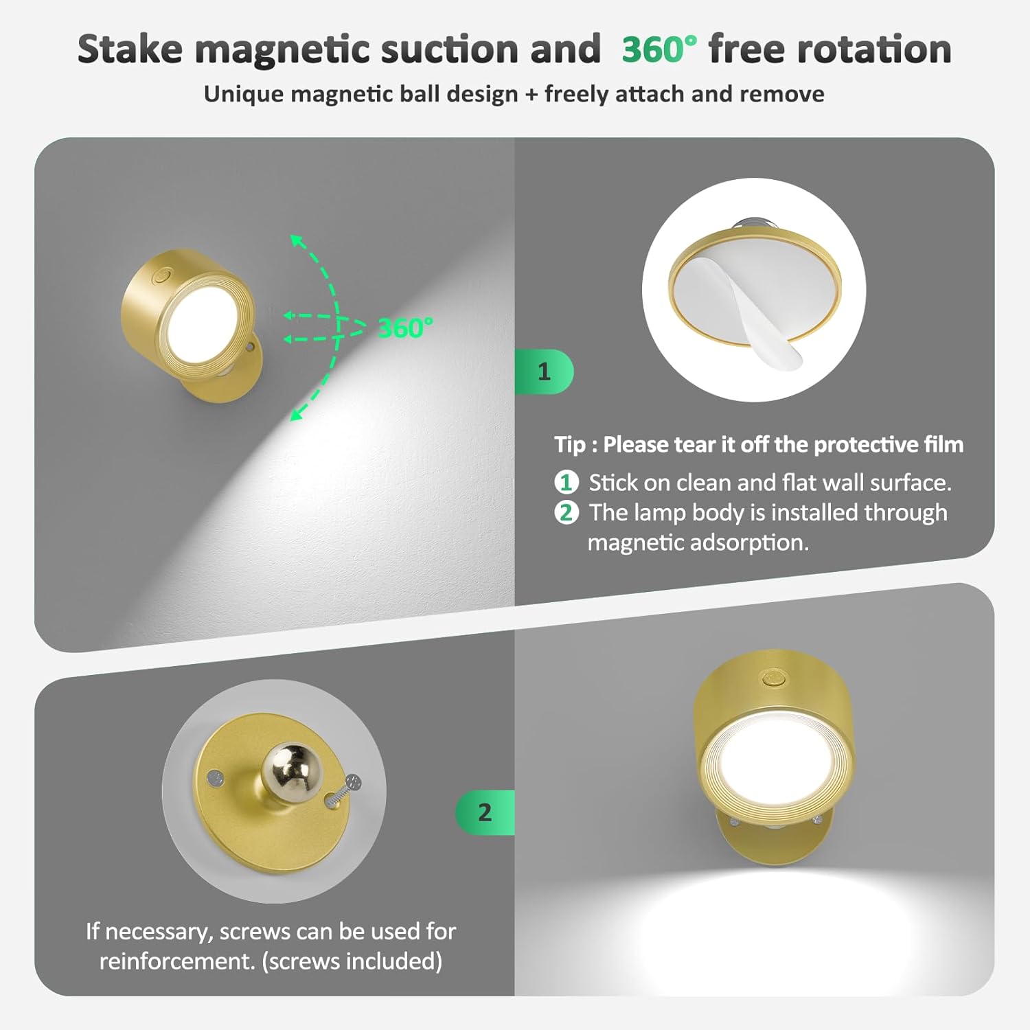 ✔️【Easy to Install】LED wall lamp is Tools-Free installation: This led wall reading lights come with magnetic mount and strong 3M adhesive. It is easy to remove the light from the magnet mount for charging.(But also come with screw, If you want to permanently fix the lamp in a certain position, you can use screw mounting.)