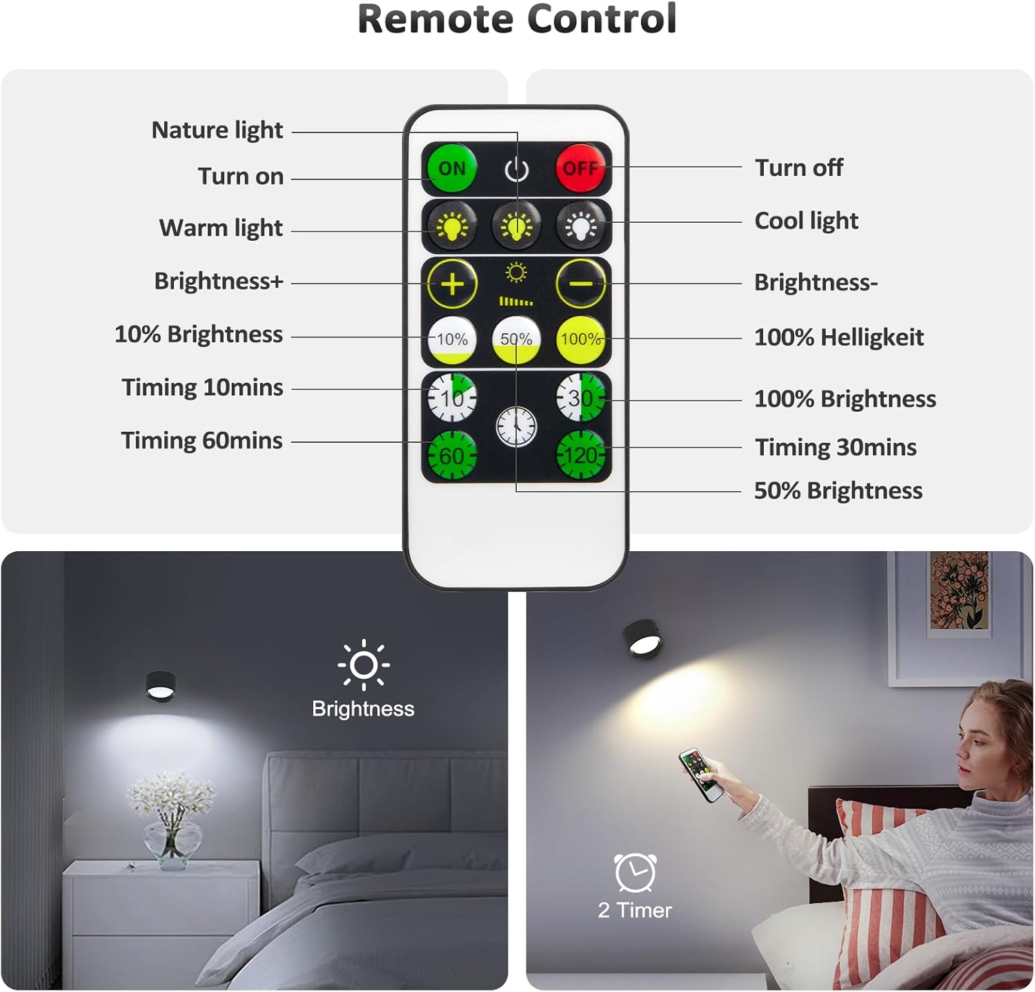 ✔️【LED Wall Lights with Button&Remote Control】Two control methods for this magnetic wall lights which are button control and remote control. Lightbiz LED wall sconce also comes with a remote. Eliminated the hassle of button control. You can complete all settings through the remote control: ON/OFF; 3 color temperature switching; brightness adjustment and Timing.
