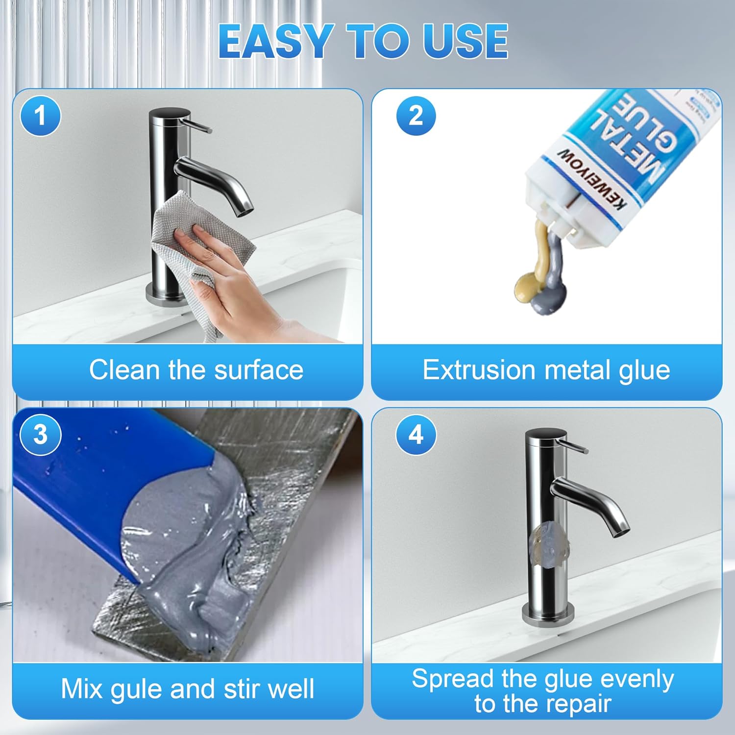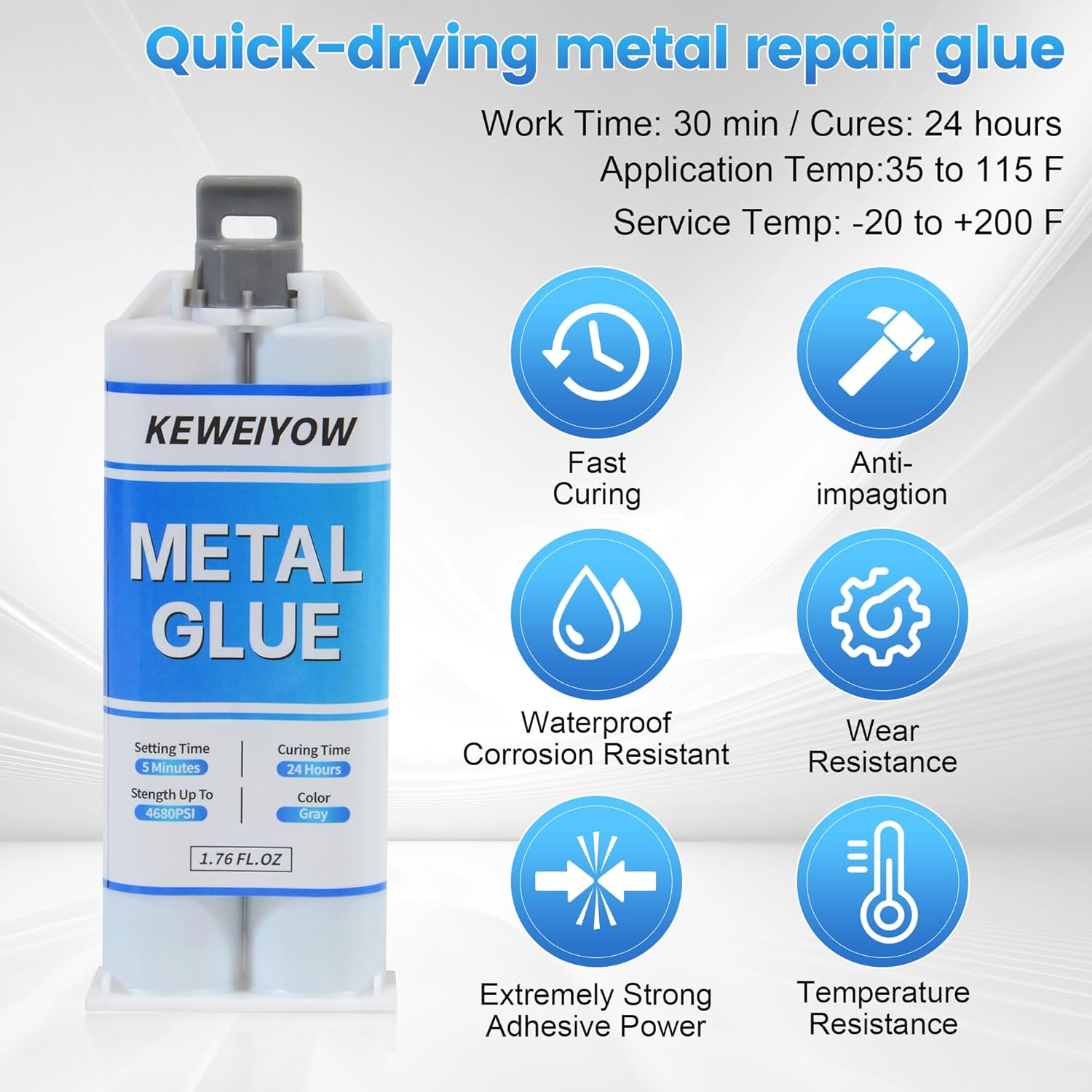 WIDE APPLICATION:Keweiyow Heavy Duty Epoxy Metal Glue is an excellent value for money, offering a wide range of applications. Our metal epoxy glue is suitable for repairing bonding metals, plastics, ceramics, glass, PVC etc. It not only can be used to repair fuel tanks, radiators, plumbing, concrete breaks, water tank, cracked bumpers, motorcycle fairings, and plastic bucket but can be used for cars, boats, heaters, broken headlight brackets, vases, swings, fence welding, car bumpers, and motorcycle crack repairand more. Its versatility makes it a must-have for any DIY enthusiast.