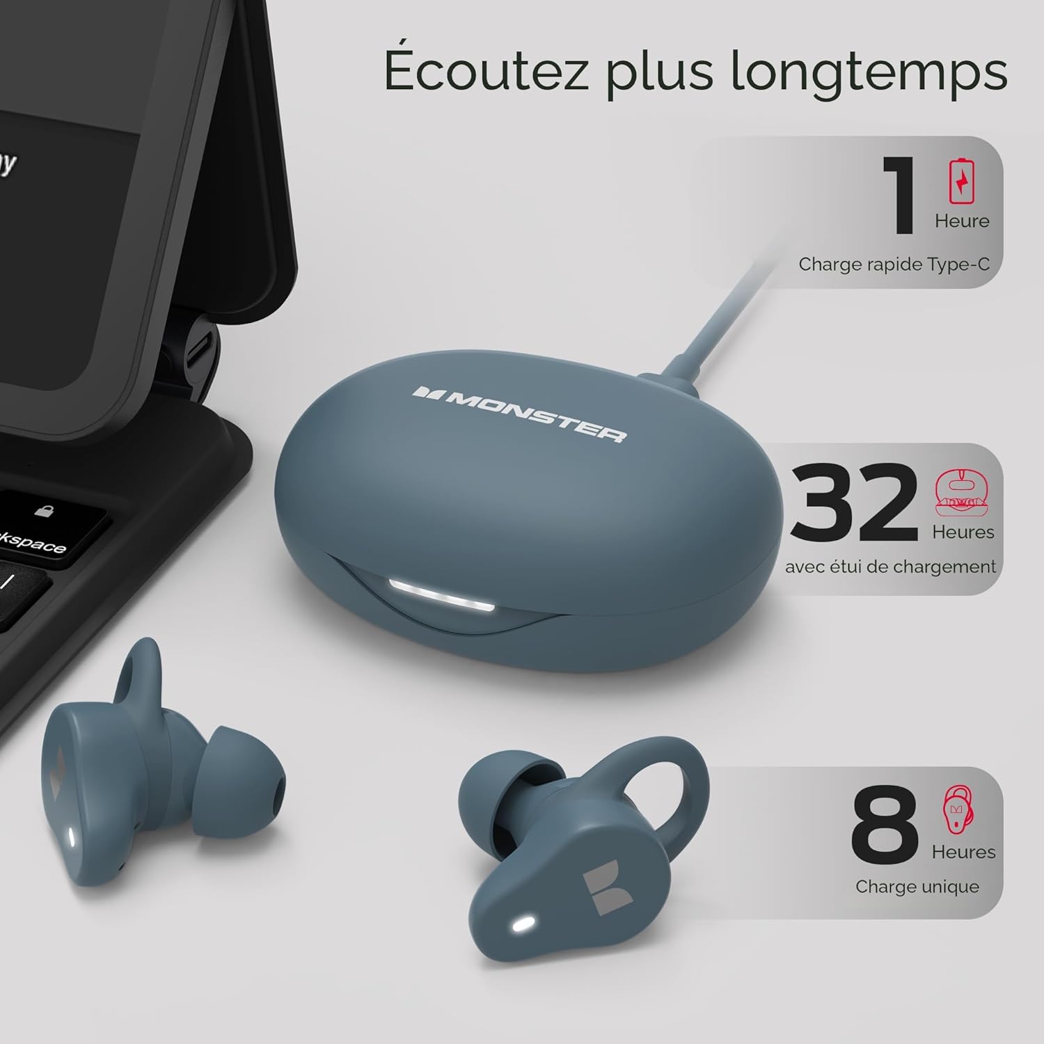 Monster N-Lite 210 Écouteurs sans fil Bluetooth, écouteurs stéréo intra-auriculaires de 5,4", microphone intégré pour des appels clairs, 32 heures de lecture, ajustement confortable, charge rapide