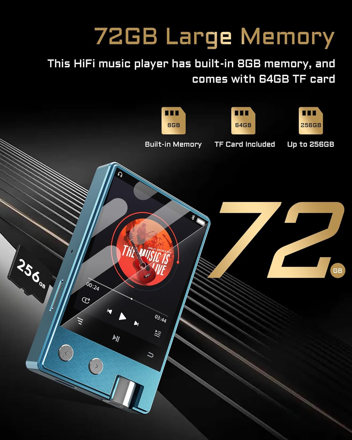【72GB Large Storage & UP to 256GB】 The MP3 player comes with 8GB of internal storage and is inserted with a 64GB TF card, enables you to store over 8000 HiFi lossless music files. Additionally, it features a built-in Micro SD card slot that can support extended memory up to 256GB. This means you can effortlessly compile all your beloved songs on this MP3 player without fretting over memory capacity constraints. You can relish your extensive music collection to the fullest.