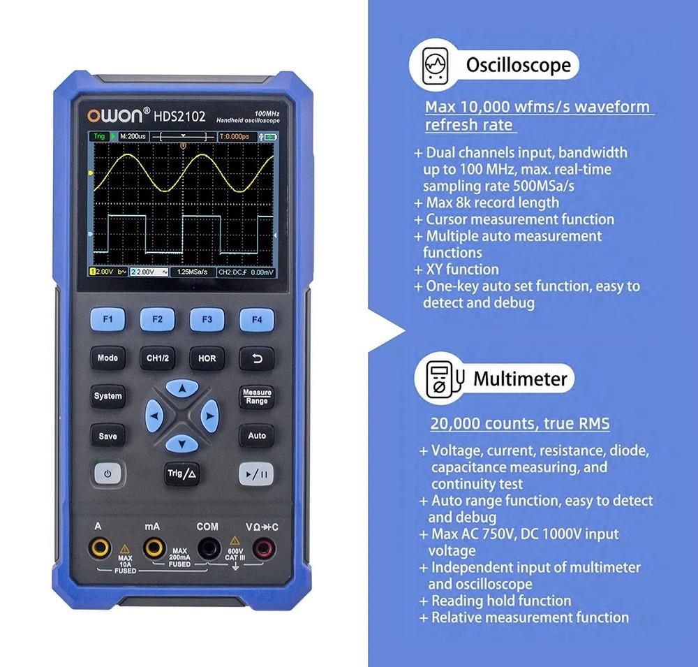 OWON HDS2102 features a digital oscilloscope function and a multimeter function at the same time. It is easy to operate and is suitable for outdoor maintenance, rapid on-site measurement, automobile maintenance, power detection, etc.