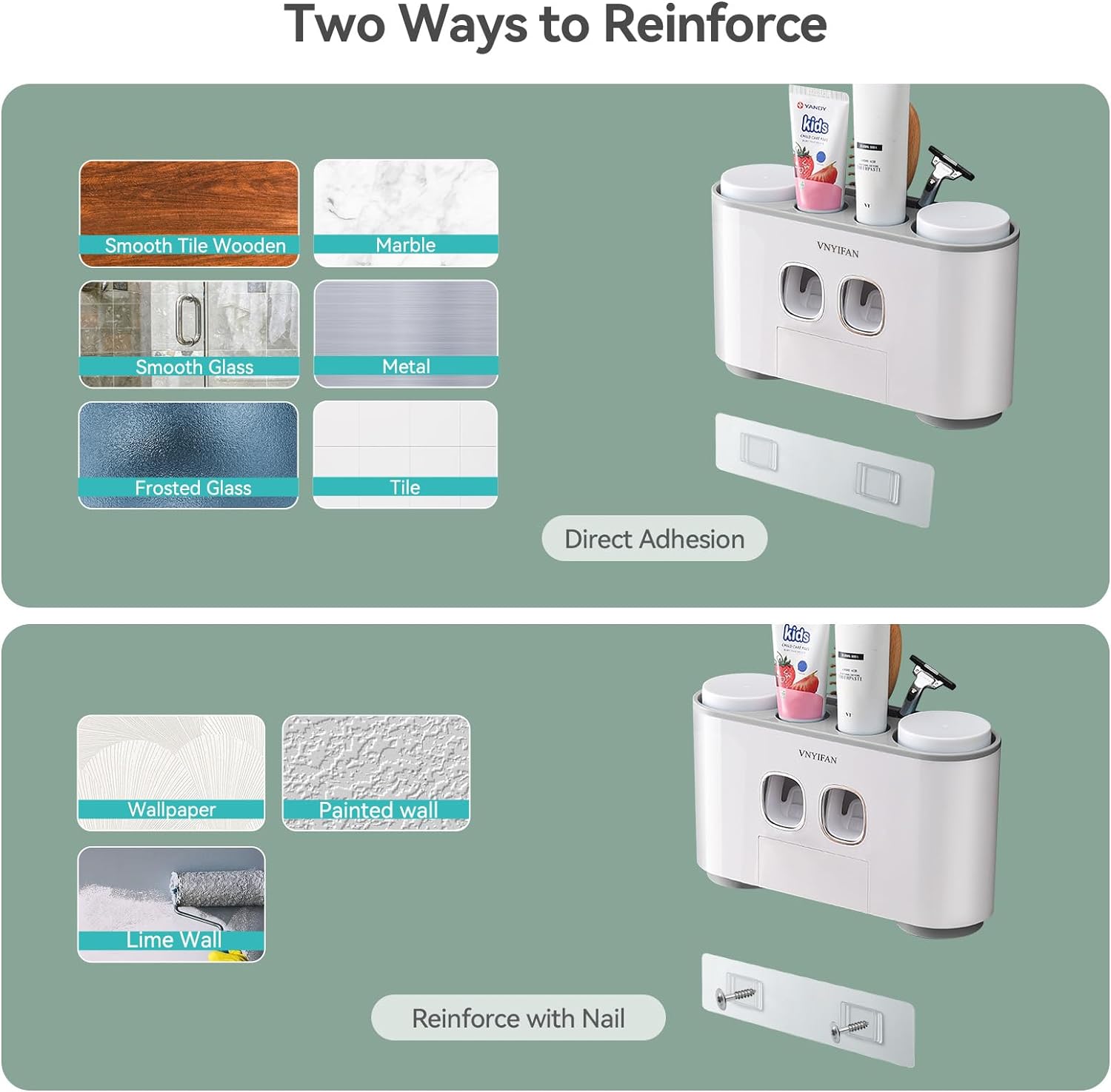 🛍️【Version améliorée, deux distributeurs de dentifrice】Le support mural pour brosse à dents est doté de deux distributeurs automatiques de pâte dentifrice intégrés. Les parents et les enfants peuvent utiliser différents types de dentifrice en même temps. Notre distributeur de dentifrice bénéficie de la technologie de la pompe à vide, qui permet à votre enfant de presser un dentifrice précis à chaque fois, ce qui permet d’économiser jusqu’à 30 % du coût.
