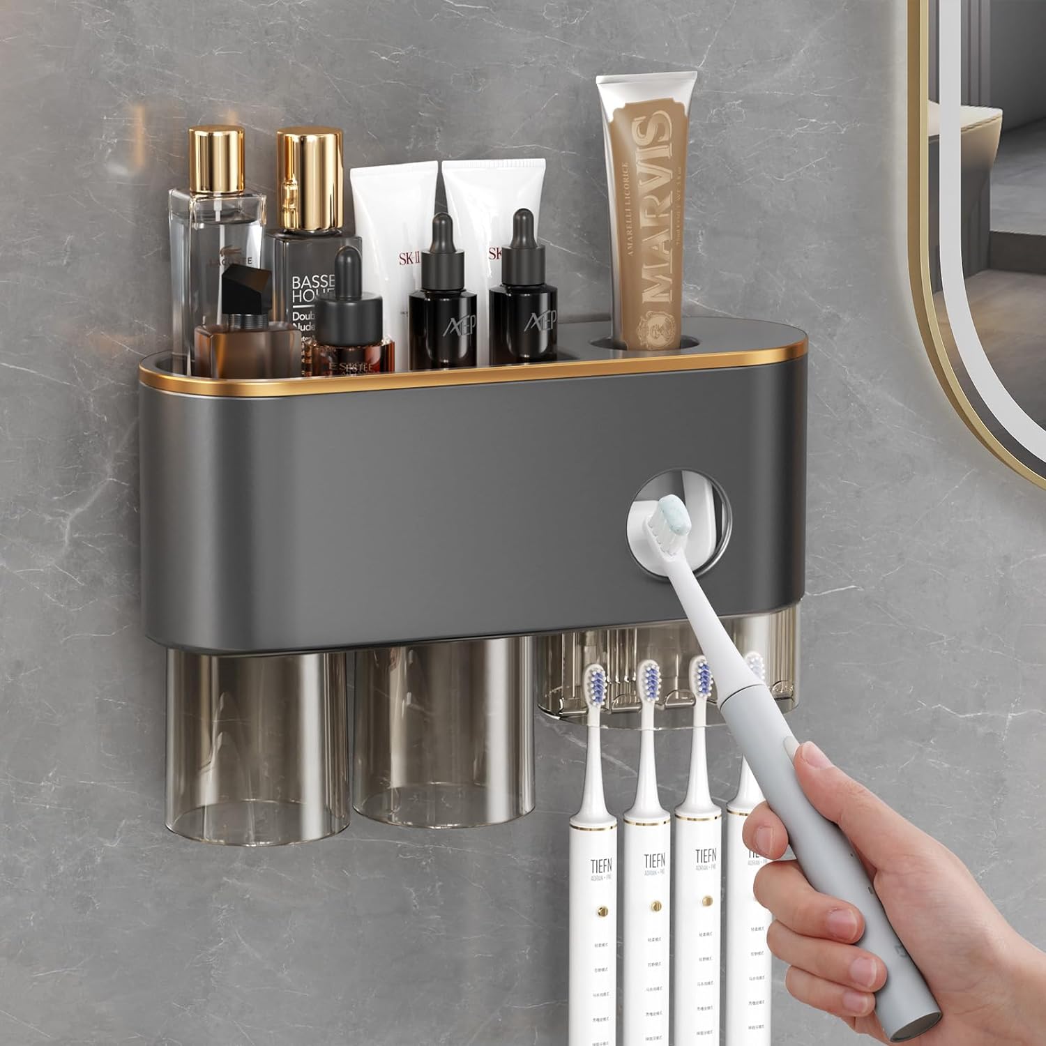 🧲【Besoins multifonctionnels】Le porte-brosses à dents est doté de 4 gobelets de bain de bouche et de 5 emplacements pour brosse à dents, ce qui peut répondre aux besoins de plusieurs personnes en même temps. Le gobelet de bain de bouche est muni d’une ventouse magnétique avec un design inversé, qui peut être fixée sur l’étagère pour un drainage rapide. Le porte-brosses à dents peut être utilisé pour les brosses à dents ordinaires, électriques et pour enfants.