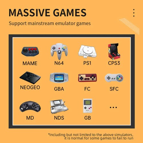 | Specification | System: Open source Linux Size: 3.5 inch IPS OCA full fit Resolution: 640*480 Supports external WiFi: You will need to configure the wireless adapter for the WiFi to work. WiFi function does not support online battle. Powkiddy will never configure the WiFi module even though some devices have a WiFi toggle. They've removed the WiFi toggle switch on the new version to avoid misunderstanding. Built-in lithium battery: 3500mAh Maximum power consumption: 5W Built-in cavity speaker: 2W Battery life: about 8 hours Charging time: 2 hours Earphone: Standard 3.5mm Type-C fast charging: Support OTG-USB: Support Input power: 5V2A CPU: ARM quad-core high-performance open-source chip Game: MAME/N64/PS/CP3/NEOGEO/GBA/NES/SFC/MD/NDS |