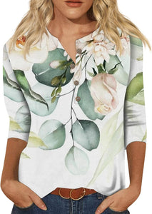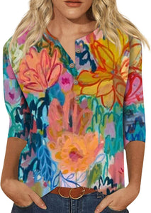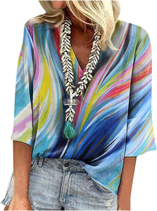 TIMEMEAN T Shirt Femme,Chemisier Tunique à Manches 3/4 à Col en V pour Femmes, Décontracté, Boutonné Et Imprimé Tie Dye, à Porter avec des Leggings