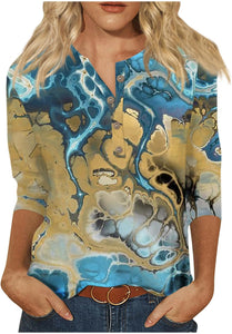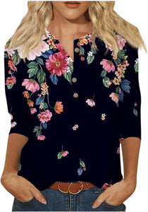 TIMEMEAN Haut Femme,Chemisiers pour Femmes T-Shirt Habillé Décontracté à Manches 3/4 Et Col V Boutonné Hauts D'Entraînement à Imprimé Floral Vintage