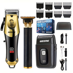 Hair Cutting Three-Piece Set, Men's Grooming Kit, Barber's Haircutting Set, Valentine's Day Gift Box. USB Rechargeable, LCD Display. Includes 1 Black And Golden Professional Hair Clipper + 1 Golden Men's Razor + 1 Golden T-Blade Trimmer + 8 Guide Com