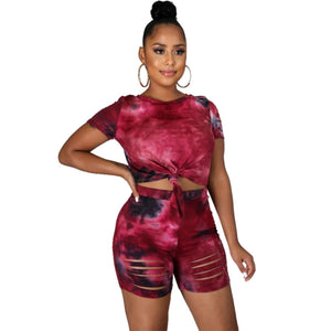 2 Piece Short Set Casual Tie Dye Print Shirt + Bodycon Shorts Tracksuit Sportswear Outfit