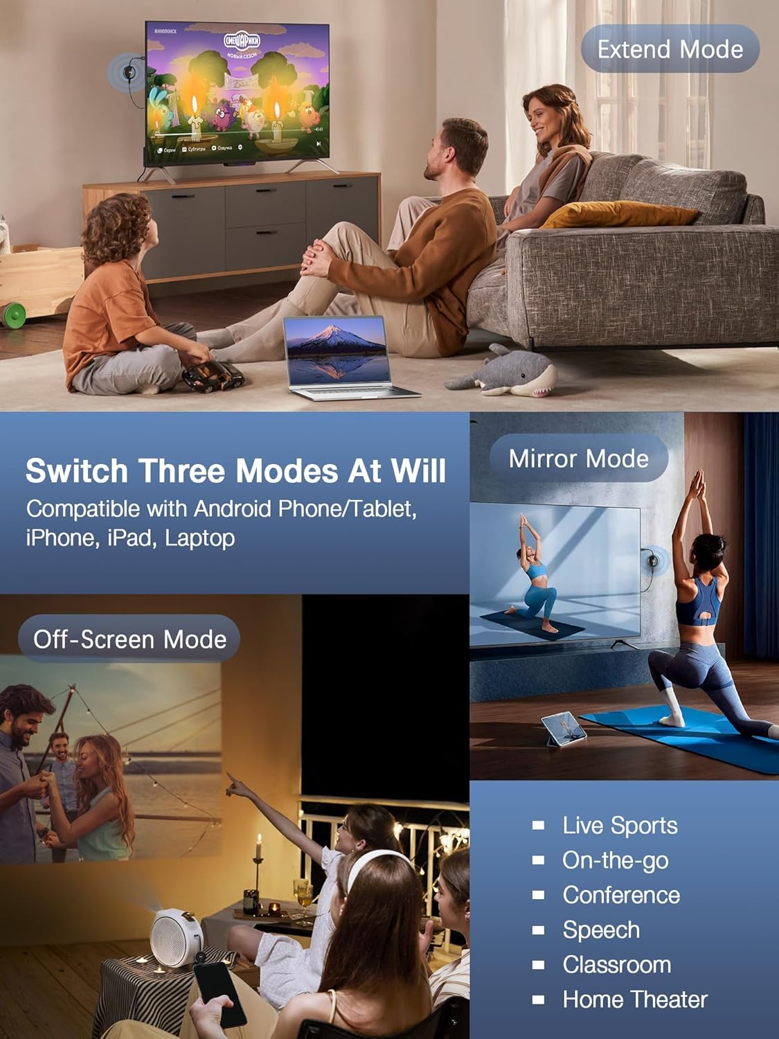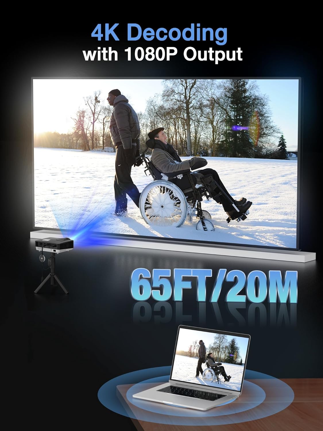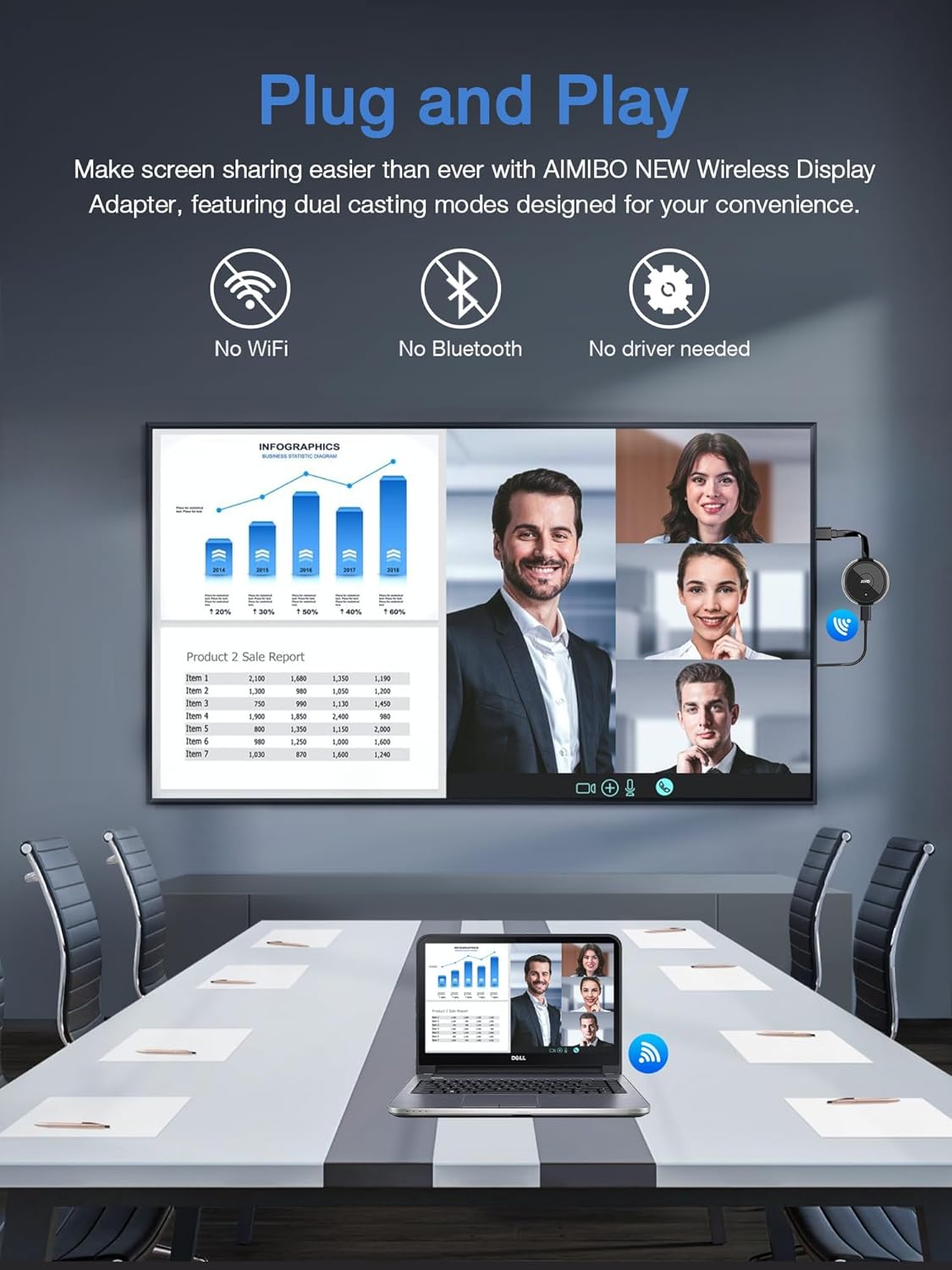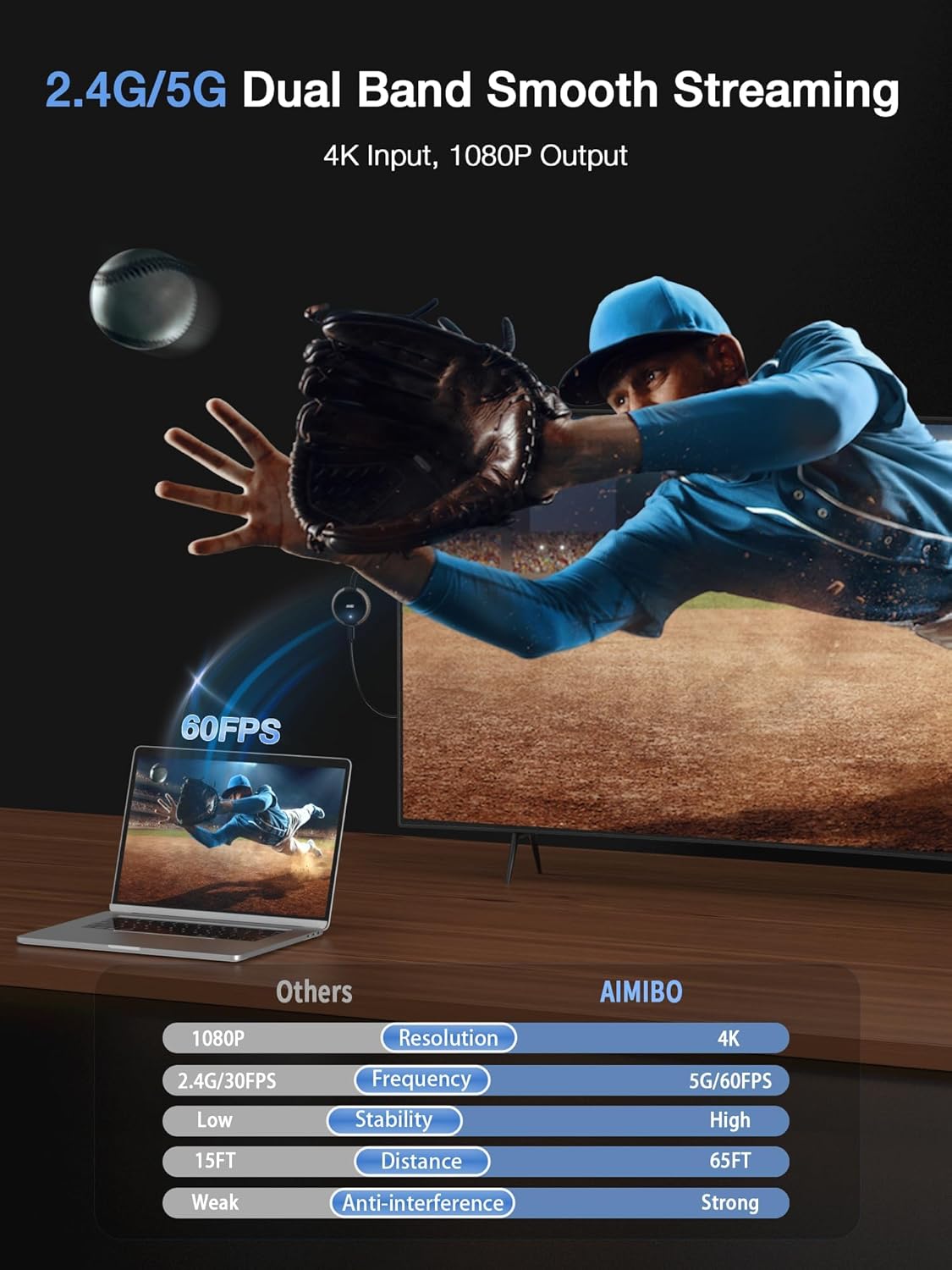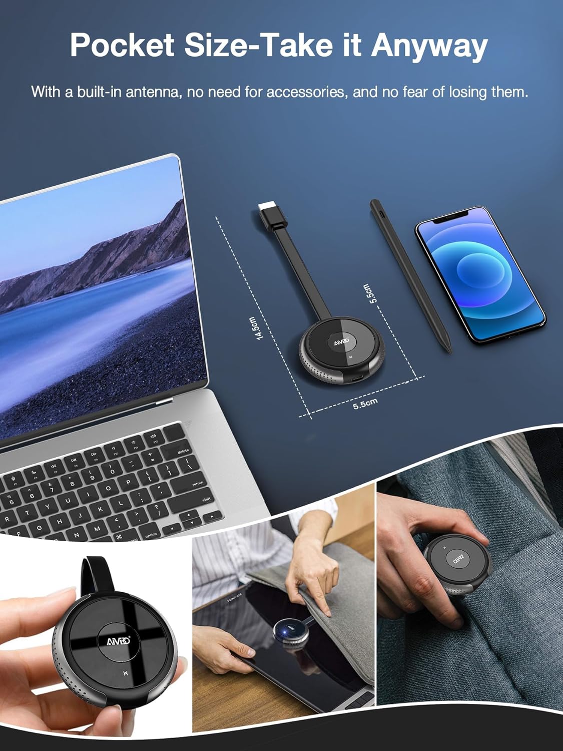 AIMIBO Adaptateur d'affichage sans fil 4K 5G – Dongle sans fil HDMI Plug & Play, streaming vidéo à partir d'Android, iOS, Windows, MacOS, tablette, ordinateur portable vers moniteur TV, projecteur est un adaptateur d'affichage sans fil AIMIBO 4K, également connu sous le nom d'émetteur et récepteur HDMI sans fil. Il permet de transmettre sans fil des signaux vidéo et audio d'un appareil source (comme un ordinateur portable ou une console de jeu) à un écran (comme un téléviseur ou un projecteur). Il est conçu pour éliminer le besoin de câbles HDMI longs et encombrants. Le système se compose de deux parties : un émetteur qui se connecte à l'appareil source et un récepteur qui se connecte à l'écran. Il est souvent utilisé pour les présentations professionnelles, le home cinéma ou le jeu vidéo, offrant une transmission de haute qualité avec une faible latence.