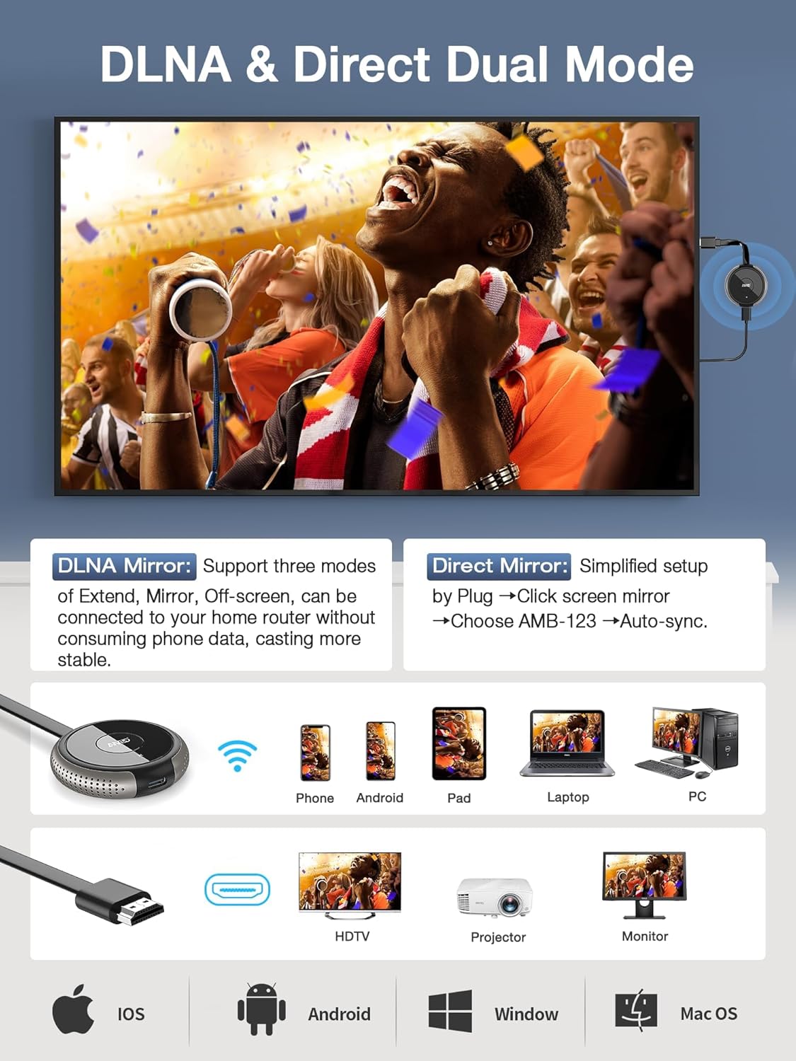 AIMIBO Adaptateur d'affichage sans fil 4K 5G – Dongle sans fil HDMI Plug & Play, streaming vidéo à partir d'Android, iOS, Windows, MacOS, tablette, ordinateur portable vers moniteur TV, projecteur