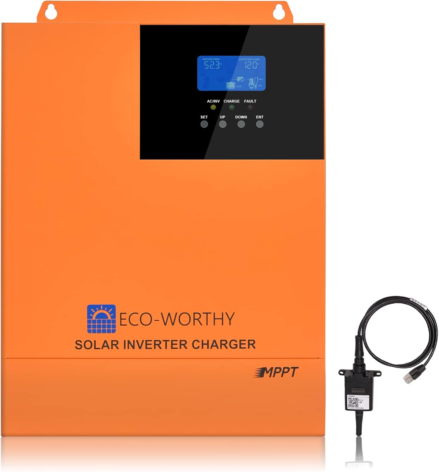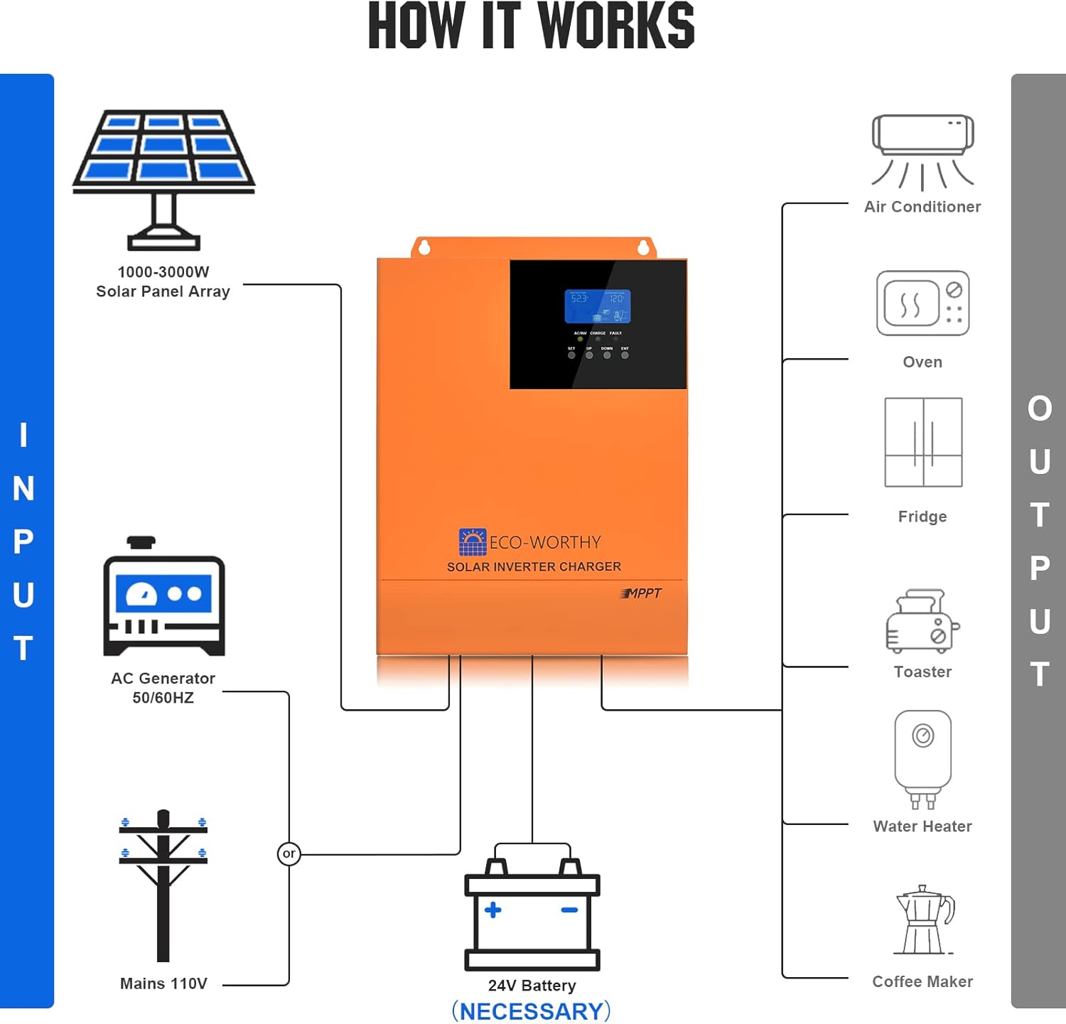 ECO-WORTHY Onduleur de chargeur hybride solaire tout-en-un intégré 3000 W 24 V Onduleur de puissance à onde sinusoïdale pure et contrôleur solaire MPPT 60 A pour système hors réseau