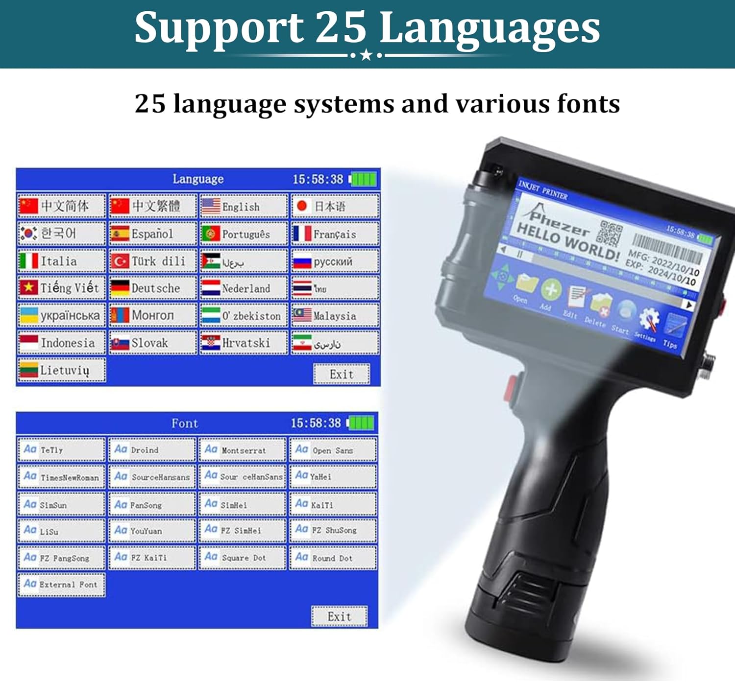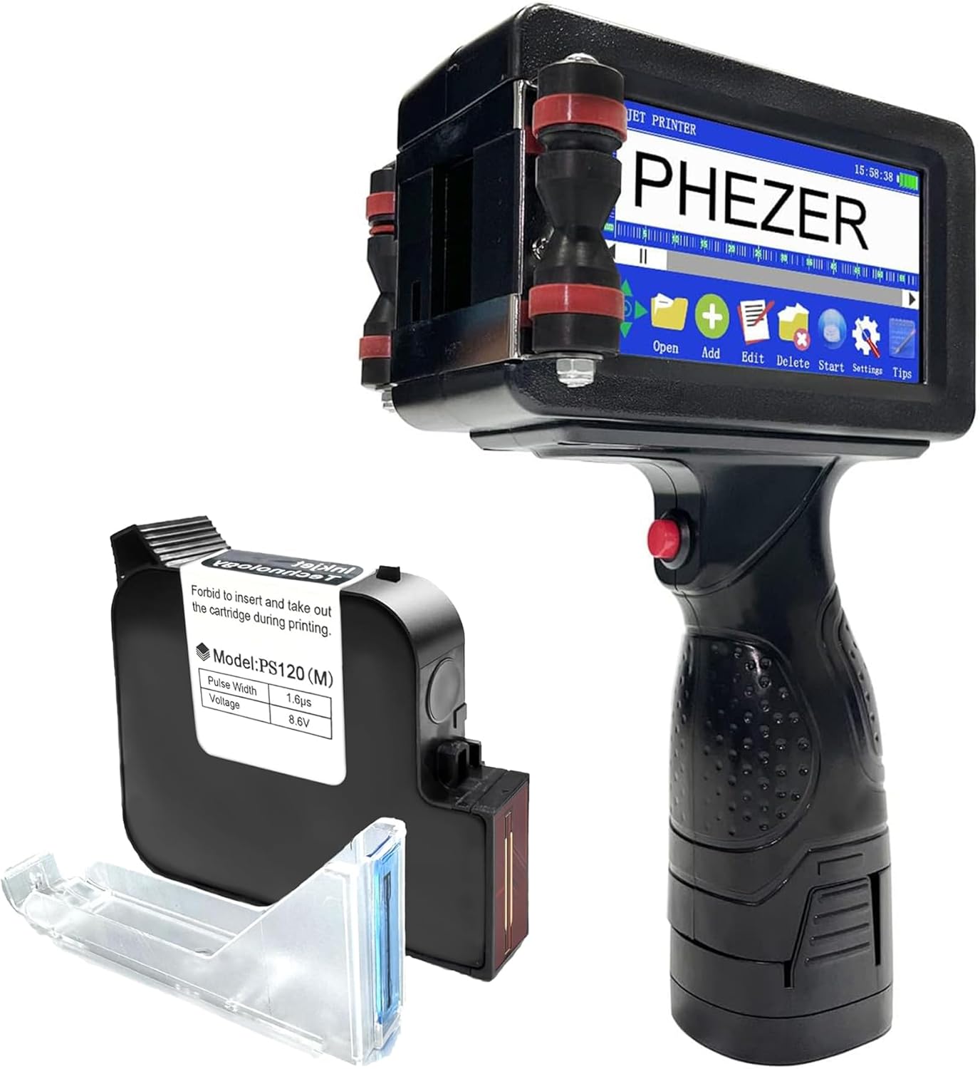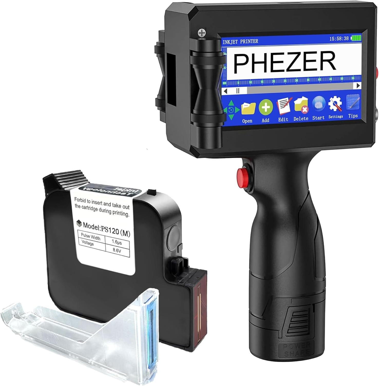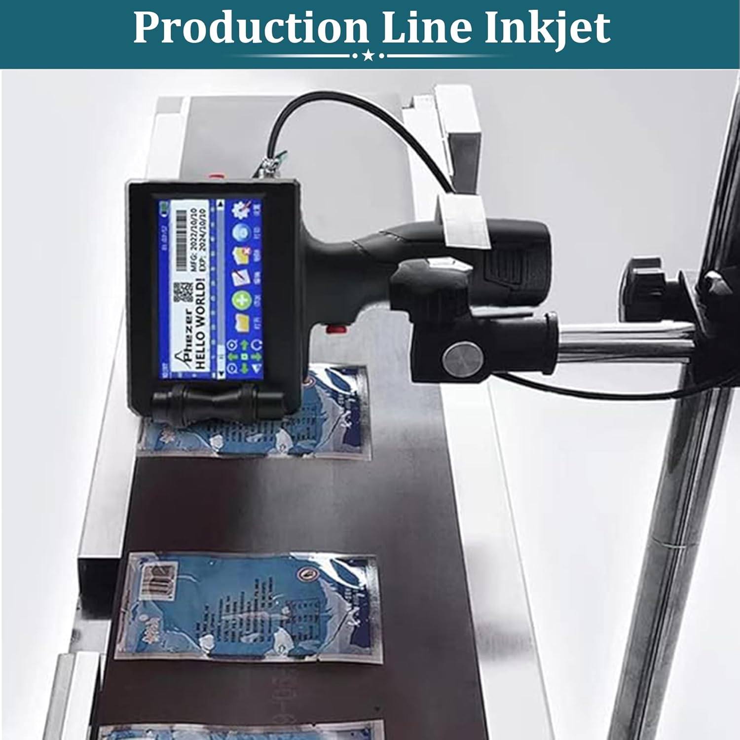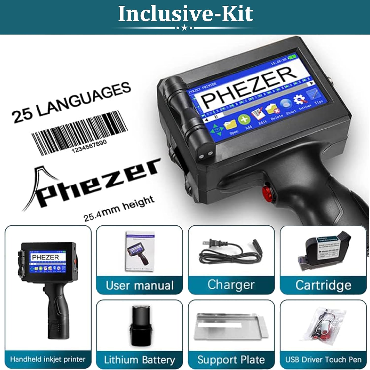 Phezer Imprimante à jet d'encre portable de 25,4 mm pour code barres QRCode Date de production Heure Logo Numéro de lot Impression sur sac en verre, carton, tissu, câble en plastique sur surface plane