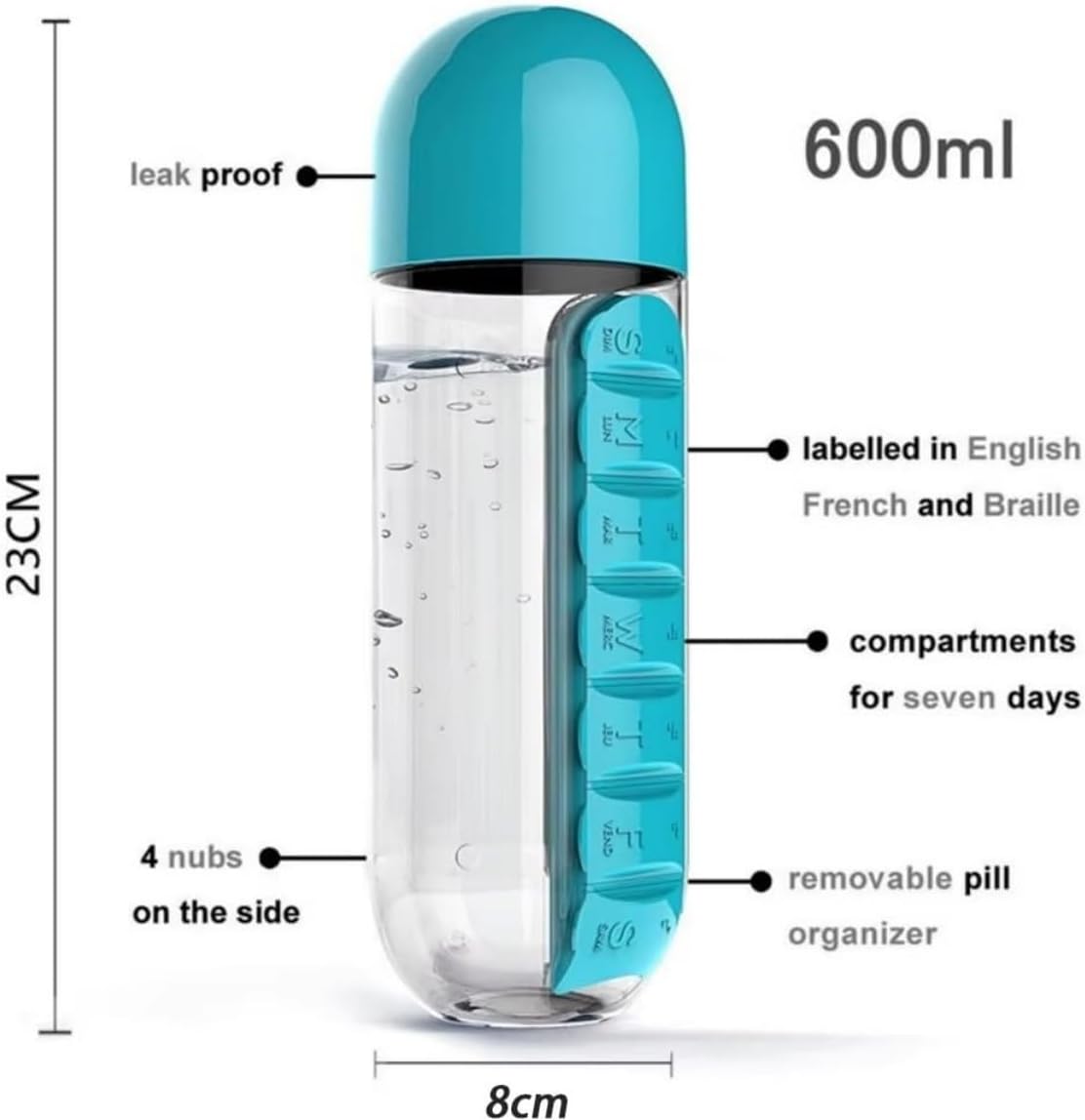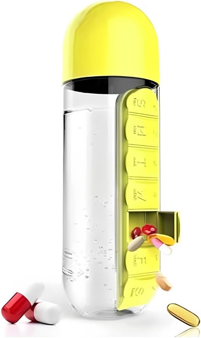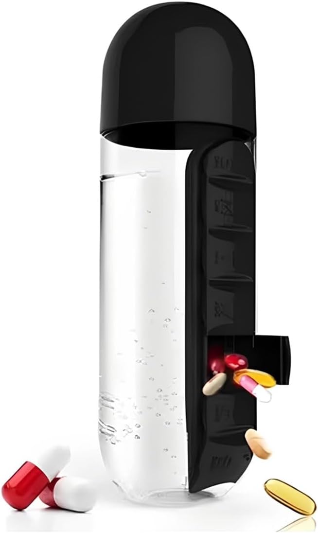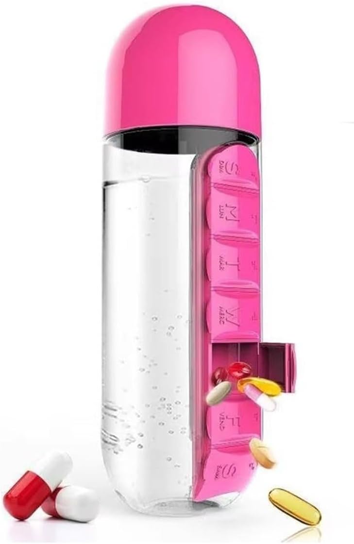 Pilulier avec bouteille d'eau, pilulier quotidien 2 en 1 de 590 ml et bouteille d'hydratation, pilulier de 7 jours pour voyage, bureau, extérieur, design portable en plastique (bleu)