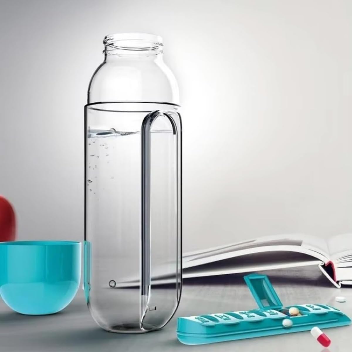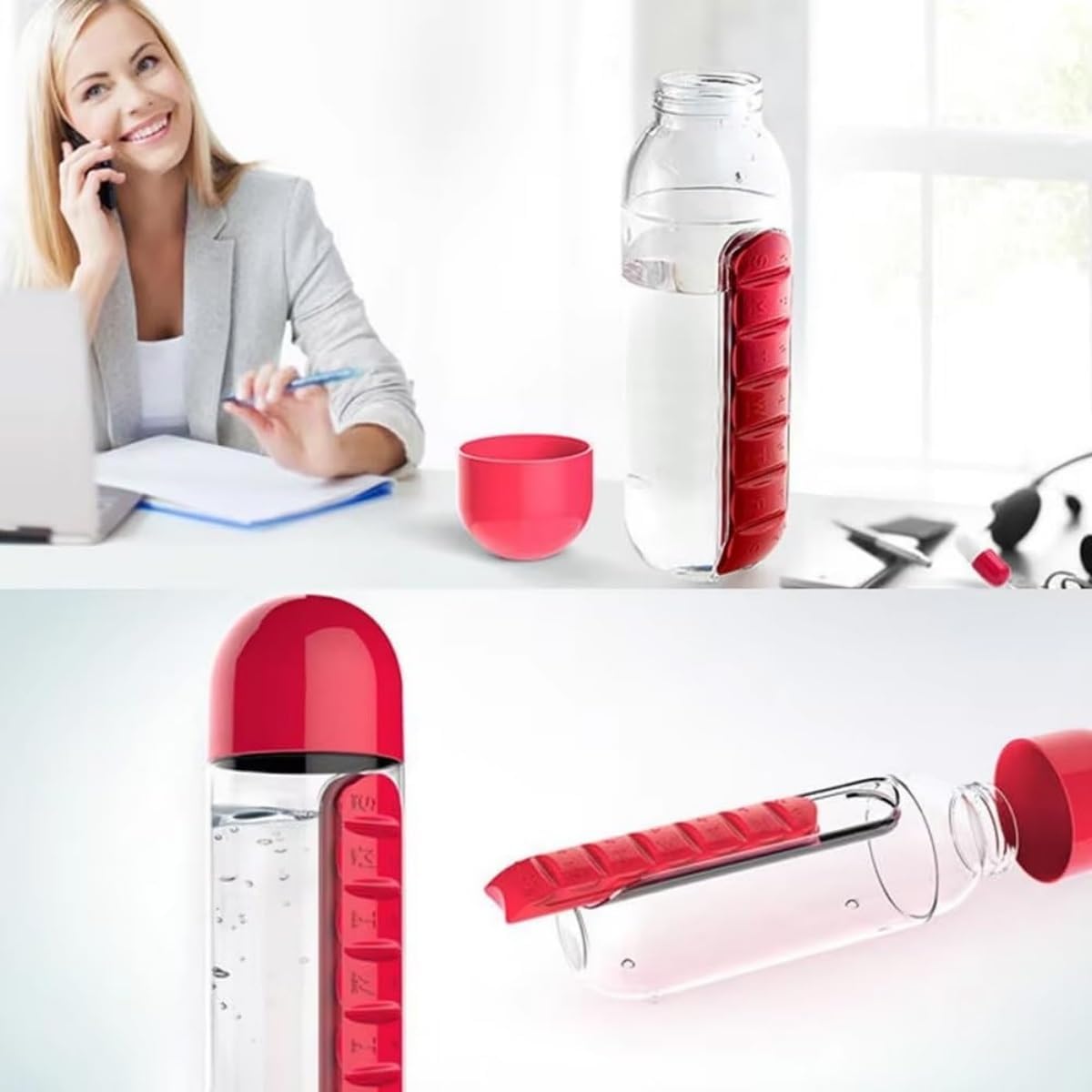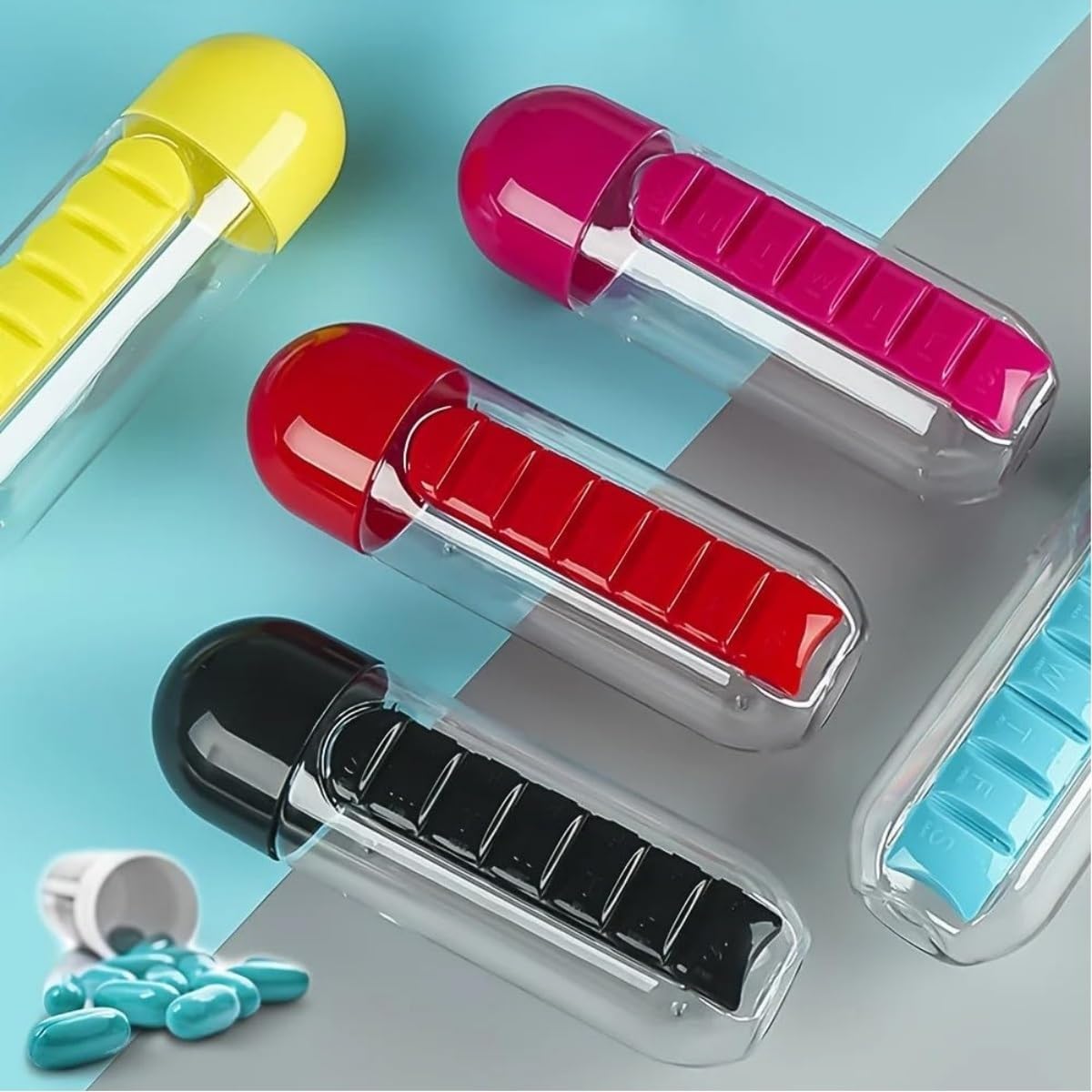 Pilulier avec bouteille d'eau, pilulier quotidien 2 en 1 de 590 ml et bouteille d'hydratation, pilulier de 7 jours pour voyage, bureau, extérieur, design portable en plastique (bleu)