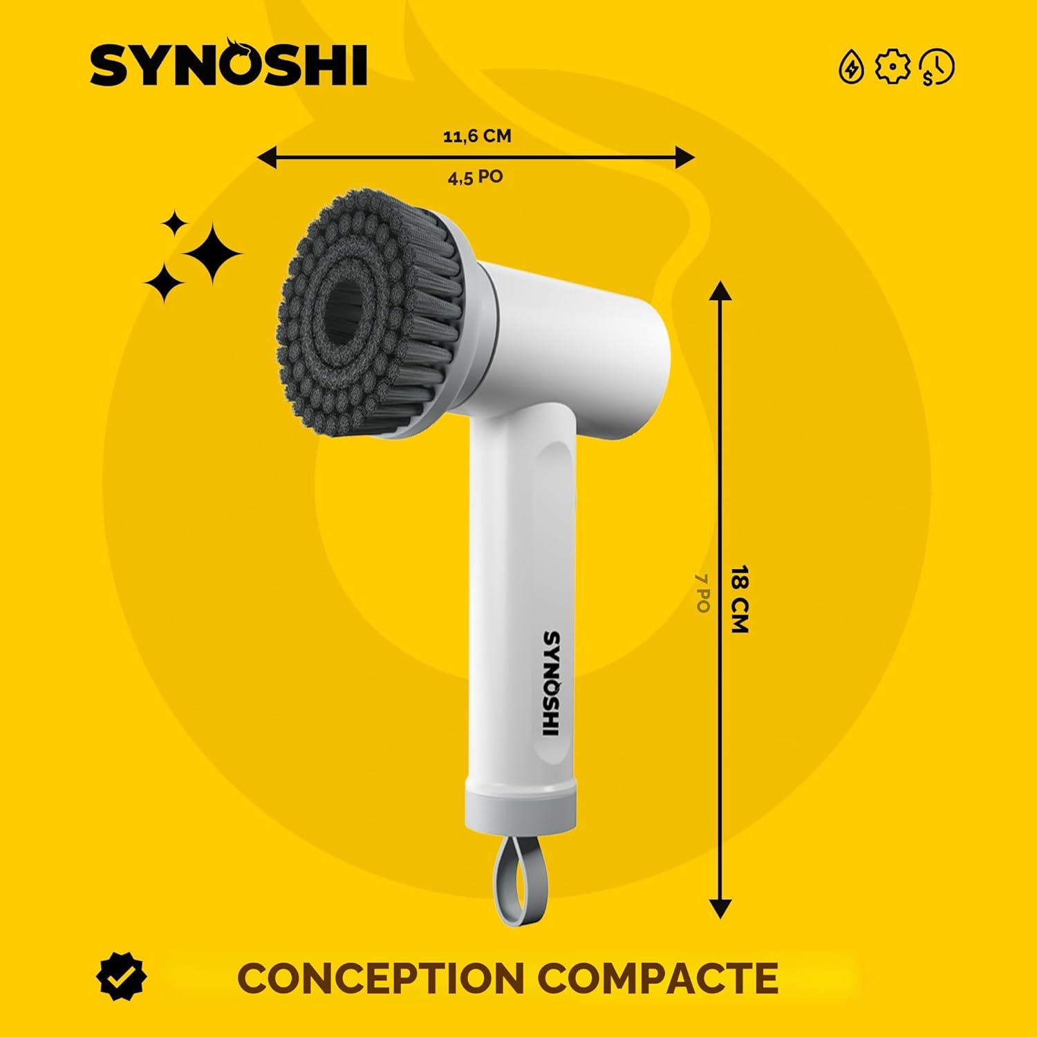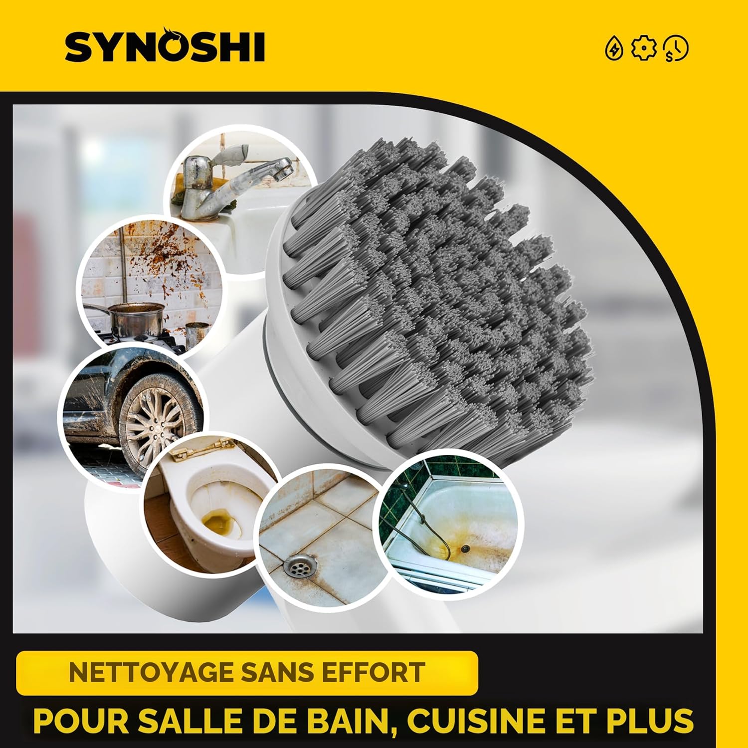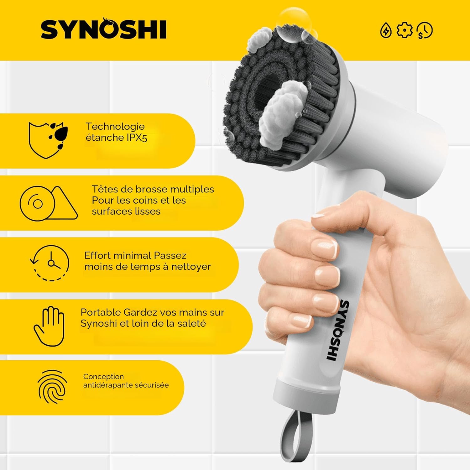 la brosse de nettoyage électrique rotative Synoshi. C'est une brosse de nettoyage sans fil et étanche avec plusieurs têtes interchangeables pour différentes surfaces. Elle est conçue pour nettoyer les salles de bain, les carreaux, les sols, les voitures et d'autres surfaces, en éliminant les taches tenaces et la saleté. La brosse est légère et rechargeable, éliminant le besoin de piles. Elle est dotée de deux réglages de vitesse pour s'adapter à différents besoins de nettoyage et peut être utilisée avec n'importe quelle solution de nettoyage.