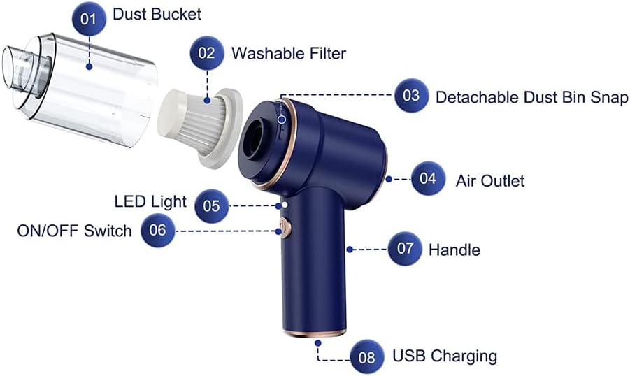 【Use Function】This portable vacuum cleaner not only sucking up dust, but also blowing away the dust, One end of the accessory connection is the vacuuming effect, can as dust buster, and the other end is the blowing function, can as air duster. Can be used not only for cars, but also for home use.